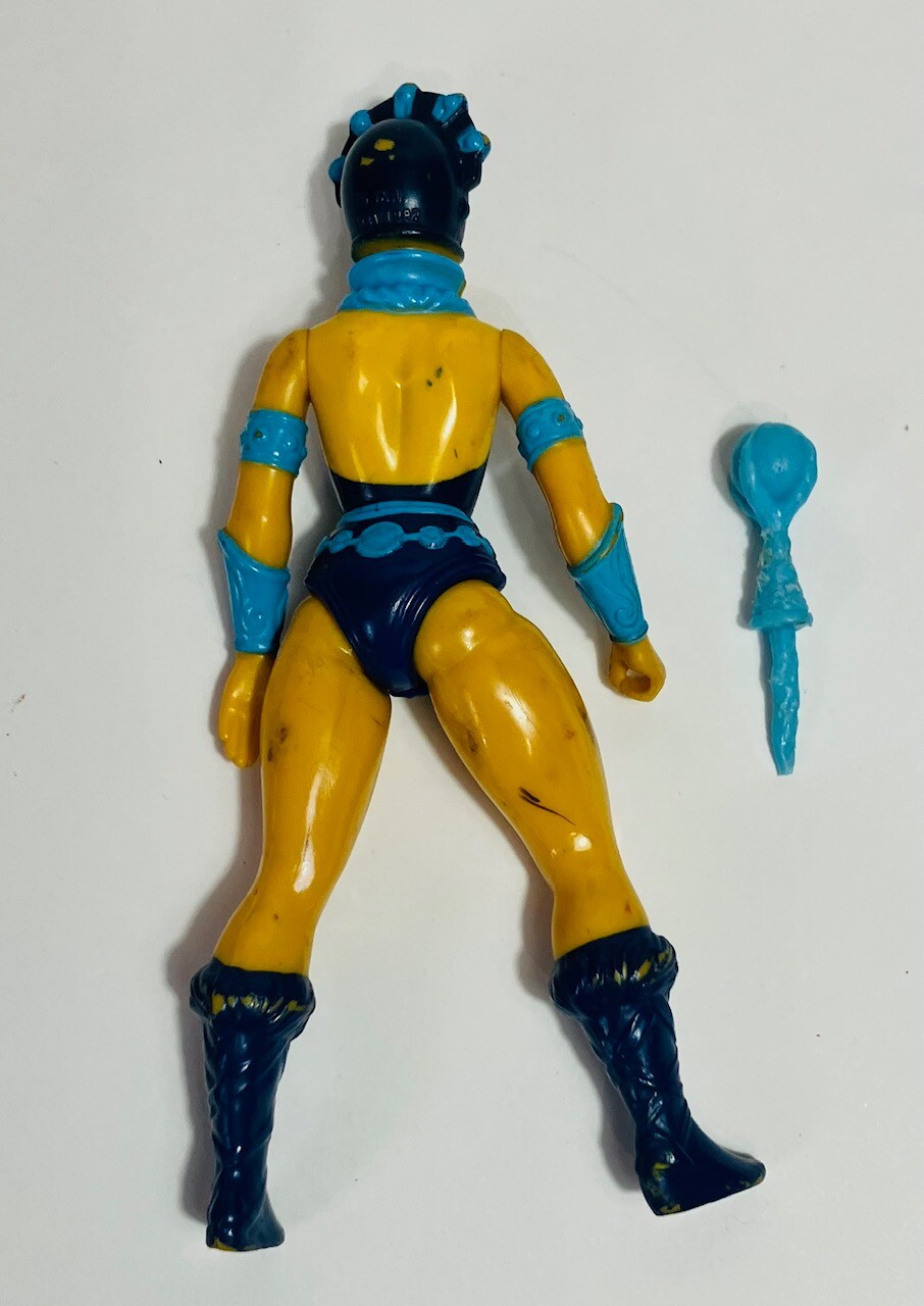Shipping is free for this vintage 1983 action figure of "Evil-Lyn" from the Masters of the Universe series. This figure is part of the Evil Warriors faction and is designed based on the character from the original television series and movie. It is a collectible item that appeals to fans of the 1980s TV, Movie & Video Games franchise. With its original design and vintage status, this Evil-Lyn action figure holds nostalgic value for collectors and enthusiasts of classic action figures from that era. The "Evil-Lyn" action figure is in good condition with slight paint wear and markings on the body. The weapon is shortened from use.