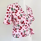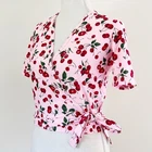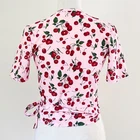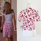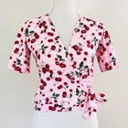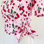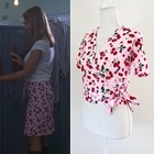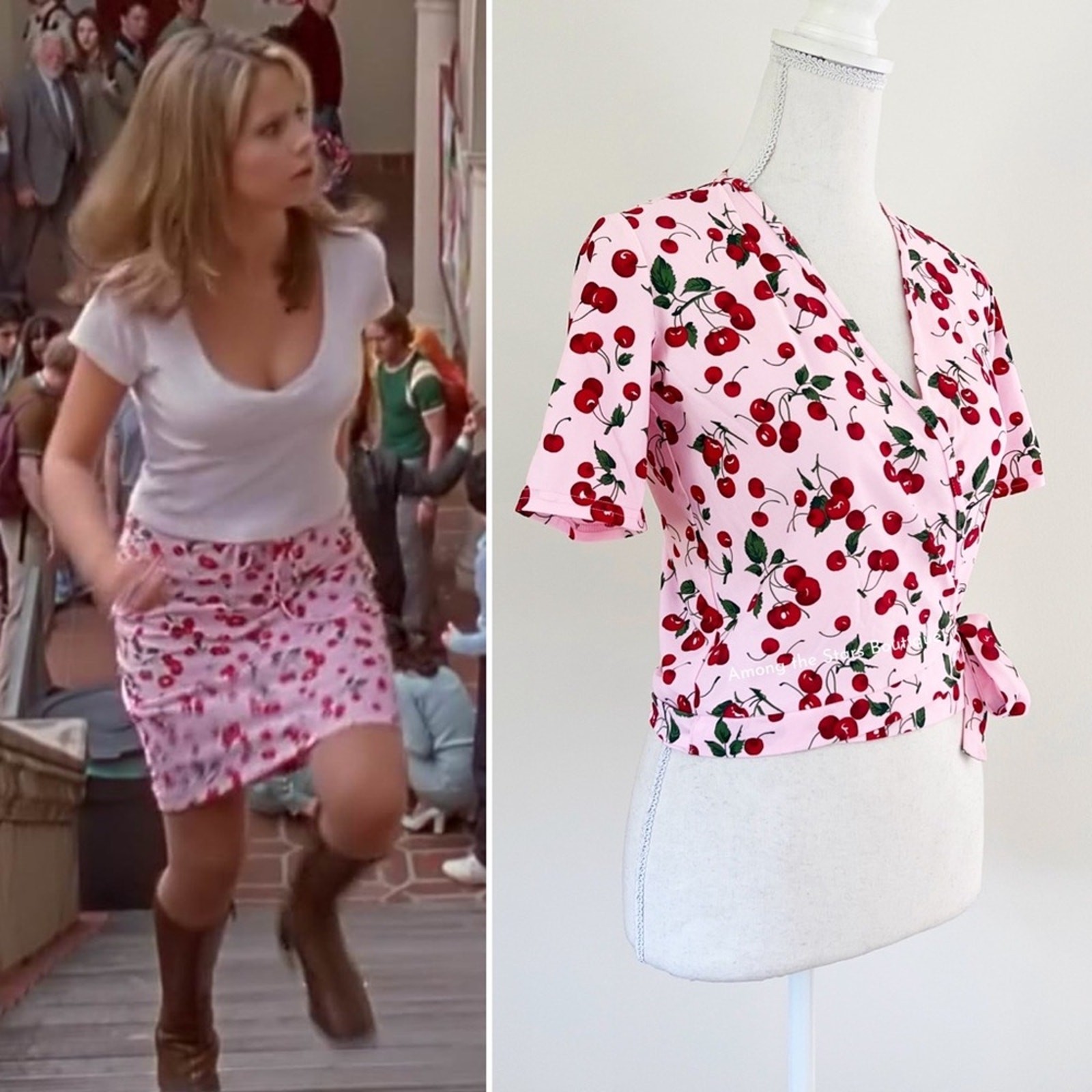 Exceptionally Rare 90s Vintage Cherry Print Top Alt. ASO Buffy Summers in BTVS Buffy wears the skirt version of this pink, cherry print top in Buffy The Vampire Slayer, season 1, episode 11, titled, "Out of Mind, Out of Sight," which aired in 1997. Same exact print, same brand! This is an extremely rare find -- one of Buffy's most ICONIC outfits! Details: - pink with red, green and white all-over cherry print - true wrap style with built in waist tie - v-neckline - short sleeve - nylon blend - in excellent vintage condition - size P (fits like an XS/S), refer to below... Approx. Lay Flat Measurements: Pit to Pit: 16" Full Length: 19" Sleeve (from armpit): 4"