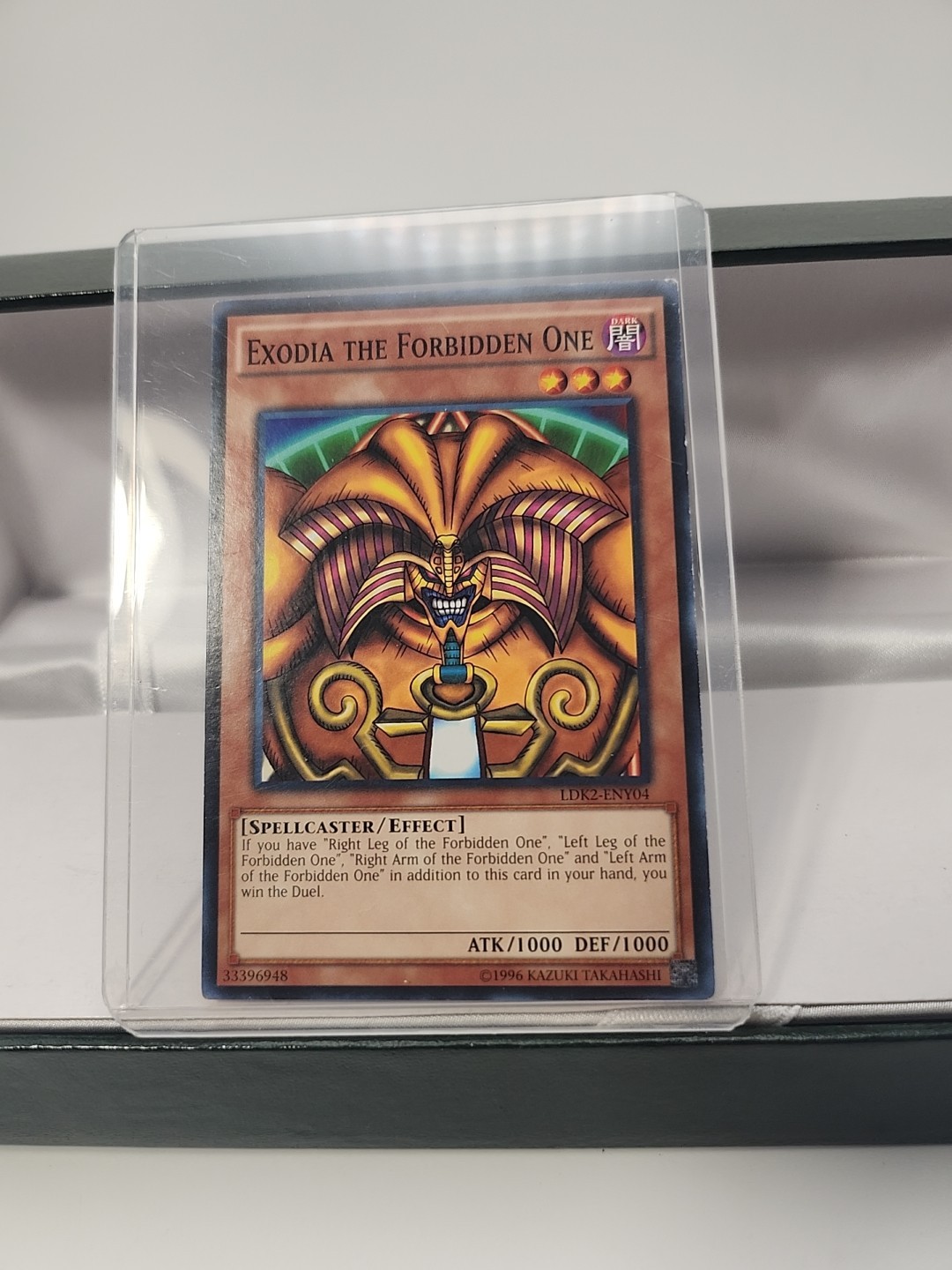 The product is a Yu-Gi-Oh! trading card from the Legendary Decks II-Unlimited Edition set, featuring the Dark attribute, Spellcaster creature type, and a high defense and attack power of 1000. It is a Common / Short Print card named Exodia the Forbidden One manufactured by Konami. The card is in English, part of the Effect card type, and has a card number of LDK2-ENY04. This rare and powerful card is sought after by collectors and players alike in the Yu-Gi-Oh! TCG game.