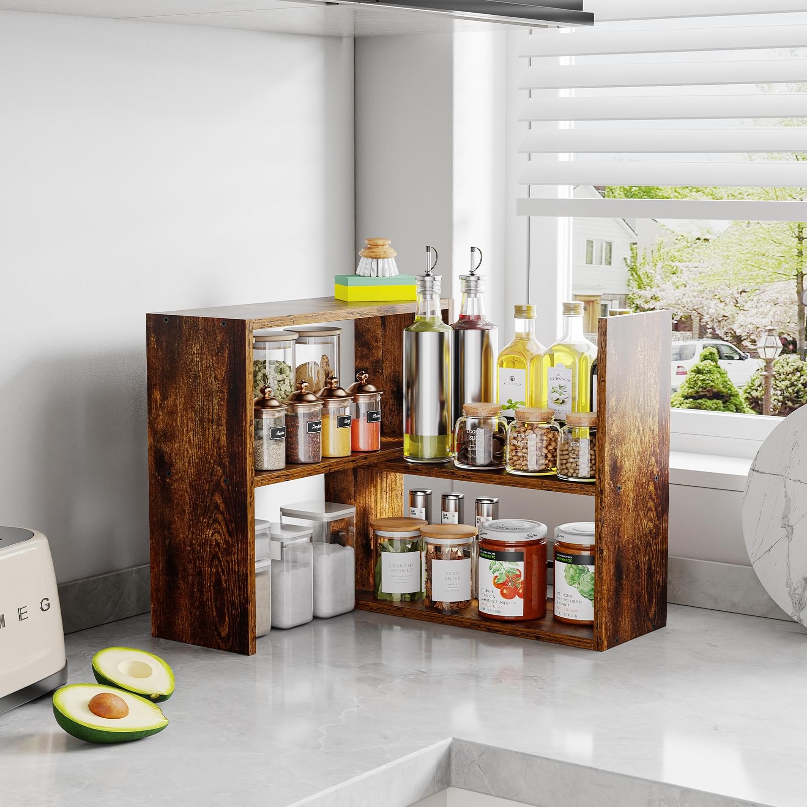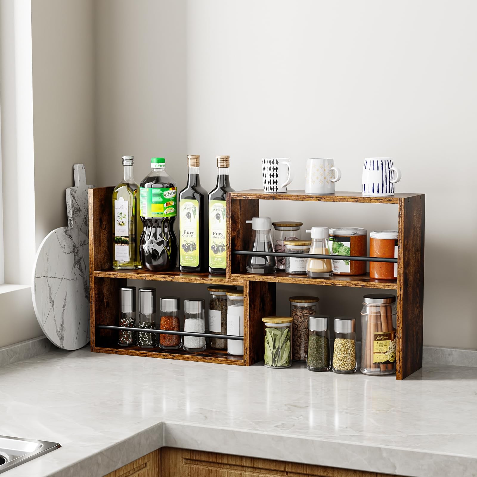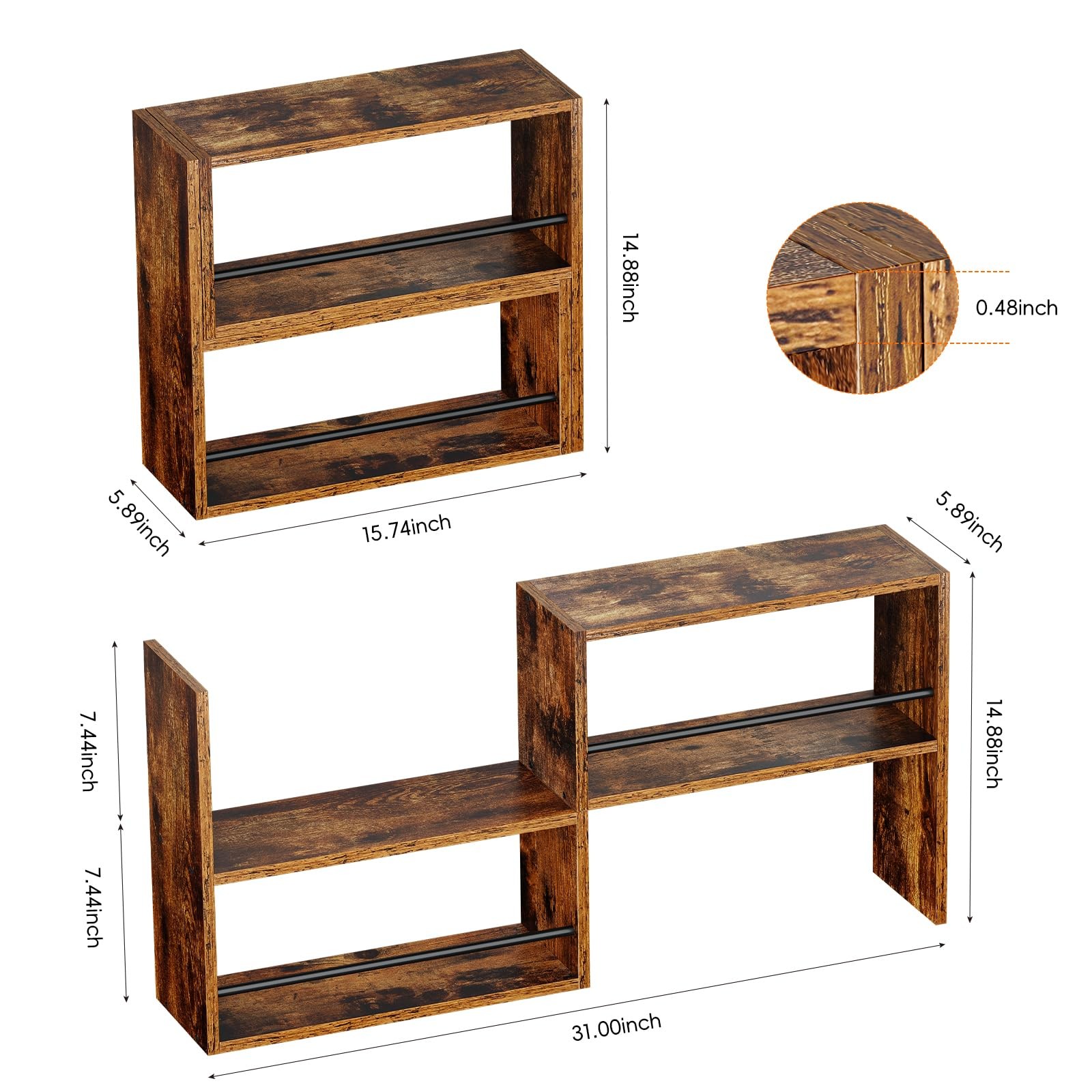 Expandable and stackable cabinet organizer shelf has multiple combination methods.It's functional. Core functions: organizer, shelf, storage Usage scenarios: kitchen, cabinet, pantry, countertop, desk, bathroom, dresser Product features: adjustable, stackable, expandable, tiered, small shelf, wood For organizer: spice rack, plate, cup, mug, coffee, dish, seasoning Space optimization: under sink, corner, space saver, riser [ Multi-Surface Adaptability] Multi-level organizer shelf is mainly used for layered storage of kitchen items such as seasonings, spice jars, containers, cans, cutlery, etc. on the kitchen countertop. Functions effectively as kitchen spice organizer, bathroom counter storage, or display shelf. [ Easy Assembly with Clear Labeling ] All parts of cabinet organizer shelf are neatly numbered and the included Allen wrench makes construction straightforward. Once assembled, you can stack them, nest them , or even arrange them in an L-shape depending on the space available. [Sturdy and Safety features] This cabinet organizer shelf is made of solid wood and metal.Black metal guard rails prevent items from sliding off, enhancing functionality for display and storage.The railing can face inward or outward [ Versatile Modular Design] This couter shelf have multiple configuration options for flexible space utilization.The countertop shelf is easy to configure or expand.The Shelf can be configured as straight shelves, L-shape for a coner shelf,or 3-tier shelf. [ Warm Tips ] Please kown that this set of two shelves aren't permanently connected.Adjustable width from 15.74 inches to 31 inches accommodates different item sizes.It is recommended to measuring clearance before pantry use.Any quality problems with the countertop organizer shelves please feel free to contact us
