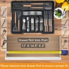 22" x 19" x 2" - Polypropylene - Silverware Drawer Organizer Core Parameters Material: Polypropylene (BPA-free PP) Size: Adjustable from 13" to 22" (W) x 14.5" to 19" (D) x 2" (H) / 33cm to 56cm (W) x 37cm to 48cm (D) x 5cm (H) Color: Black (Matte finish) Weight Capacity: 2 lbs / 0.9 kg Technical Specifications • Adjustable Length and Width: Patented system expands from 13" to 22" (W) and 14.5" to 19" (D) with modular dividers • 9 compartments + 2 removable knife holders for cutlery/jewelry/stationery • Anti-slip base with buckle design for secure placement • Easy to clean (water rinseable) Package Information Package Dimensions: 22" x 19" x 2" / 56cm x 48cm x 5cm Package Weight: 2.51 lbs / 1.14 kg