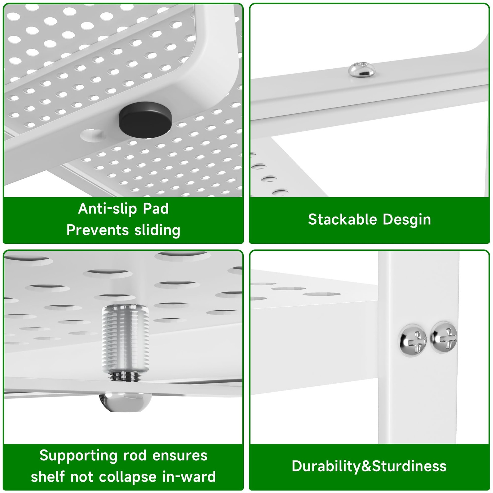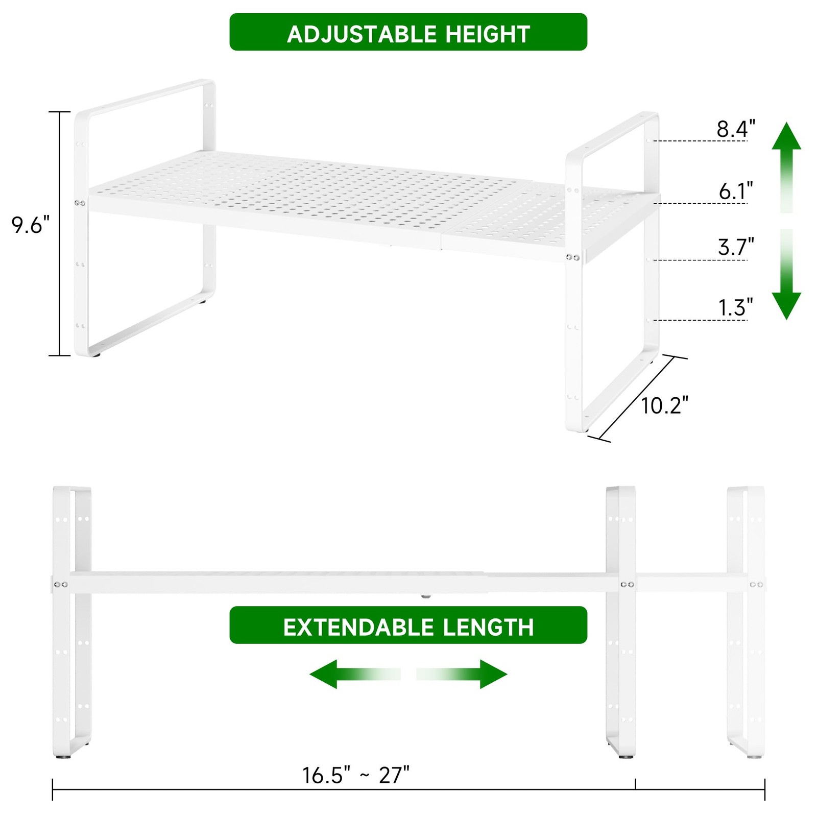 Multifunctional Shelves: You can use the shelf as an individual cabinet organizer, kitchen cabinet organizer, locker shelf, desk shelf, spice rack organizer for cabinet, countertop organizer, bathroom counter organizer, pantry organizers and storage, pantry organizer, under desk storage, counter shelf, storage shelf, closet shelf organizer, small shelves, small rack shelf. You can also use the shelves as shelf riser for cabinet, locker, spice rack, pantry organizer cupboard countertop desk NOTE: If you have any questions, please contact us first, and we will reply to you within 24 hours, so that you can reduce the trouble caused by return. STACKABLE INDEPENGENT CABINET SHELF:The cupboard organizers and storage is a kind of independent storage shelf, which is used to improve the storage space of the cabinet and max the storage efficiency. In the process of use, you can use it alone, or you can stack two shelves together to form a 2-layer shelf to store your goods. EXTANDABLE KITCHEN COUNTERTOP ORGANIZER : This is a very flexible countertop organizer rack, and its height and length can be adjusted according to your needs. The size before expansion is 16.5 "L x 10.2" W x 9.6" H, the length of the shelf organizer can be stretched from 16.5 inches to 27 inches. HEAVY DUTY METAL CABINET SHELF: The adjustable cabinet shelf is made of high-quality metal, which is very durable and can be used for a long time. The bottom is fixed with screws and support rods to prevent the shelf from sagging. The shelf surface is coated with powder to protect it from rust and corrosion. Simple design, very suitable for your home or office. MULTI-FUNCTIONAL EXPANDABLE ORGANIZER SHELF: It can be a rack or shelf to meet your organizational purpose. The surface has a mesh design, which can achieve the effect of draining. It is an excellent organizer of plates, bottles, cans, pots and pans. It is also a spice shelf for storing snacks, spices, condiments, fruits, etc. It is also the perfect organizer of the dresser. It will make your countertop more clean and tidy. EASY TO INSTALL: This is a shelf that is very easy to install. You only need to install a few nuts according to the instructions, and my junior high school sister can complete the installation independently.