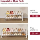【2-Tier Shoe Rack】The shoe rack organizer makes perfect use of the awkwardly cramped space under your wardrobe and is the perfect choice for expanding your initial storage space 【Expandable & Adjustable】The size of the retractable shoe shelf can be adjusted according to your needs it can hold sundries in Entryway Doorway, and Bedroom. Dimension:28.74"W x 8.66"D x 13.58"H Fully expanded 41.73"W x 8.66"D x 13.58"H 【Customized Storage】Stack up to multiple units that maximize storage space in the same footprint. (Purchase 2 and more units to build storage vertically) 【Sturdy & Durability】Made of thickened metal tube with powder coated finish, our shoe organizer for closet is smooth and with strong corrosion resistance. Coming with 4 non-slip foot pad effectively enhances the stability of the white shoes rack. 【Easy to Assemble】Clear and detailed instructions, and numbered parts for assembly are included in the package to ensure you assemble the closet shoe organizer easily and quickly. Product description Knob Design Provide you with convenient installation. Extended Fixation The length of the shoe rack can be adjusted according to needs. Stackable Design Provide more possibilities for your storage space. Slanted Design Save more space for you. More Shoe Racks Add to Cart Add to Cart Add to Cart Add to Cart Add to Cart Add to Cart Customer Reviews 4.4 out of 5 stars 1,788 4.4 out of 5 stars 1,788 4.4 out of 5 stars 1,788 4.4 out of 5 stars 1,788 4.5 out of 5 stars 278 4.5 out of 5 stars 278 Price $22.99 $ 22 . 99 $19.99 $ 19 . 99 $22.99 $ 22 . 99 $29.99 $ 29 . 99 $62.99 $ 62 . 99 $47.99 $ 47 . 99 Number of Shelves 1 2 3 4 6 6 Color Black White Black White Brown & Black White & Gold Special Feature Expandable Expandable Expandable Expandable Large Capacity Large Capacity Feature Easy to Assemble Easy to Assemble Easy to Assemble Easy to Assemble Easy to Assemble Easy to Assemble Size 8.7"D x 41.7"W x 6.9"H 8.7"D x 41.7"W x 13.6"H 8.7"D x 41.7"W x 19.5"H 8.7"D x 41.5"W x 25.4"H 11.8"D x 29.65"W x 39.4"H 11.8"D x 29.65"W x 39.4"H