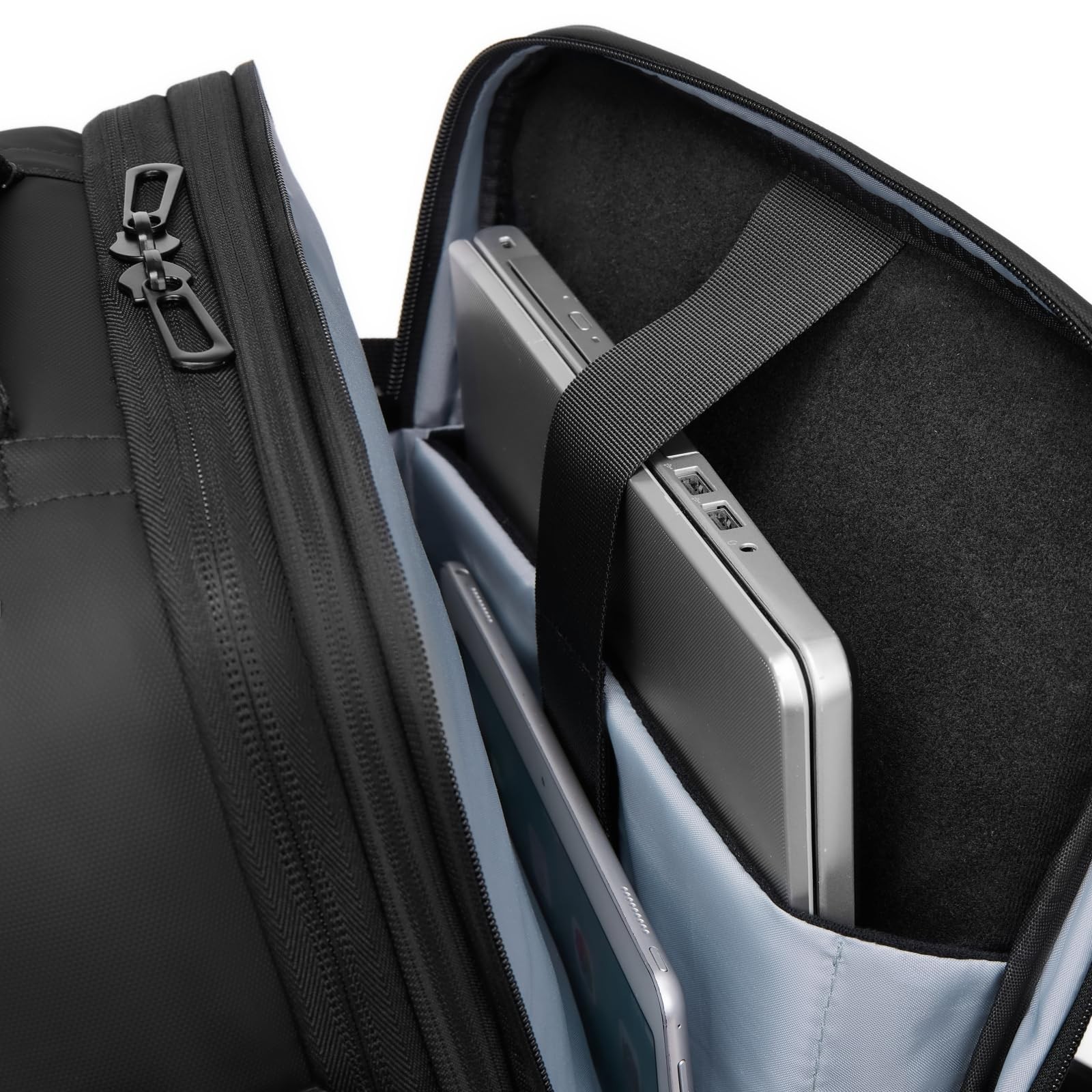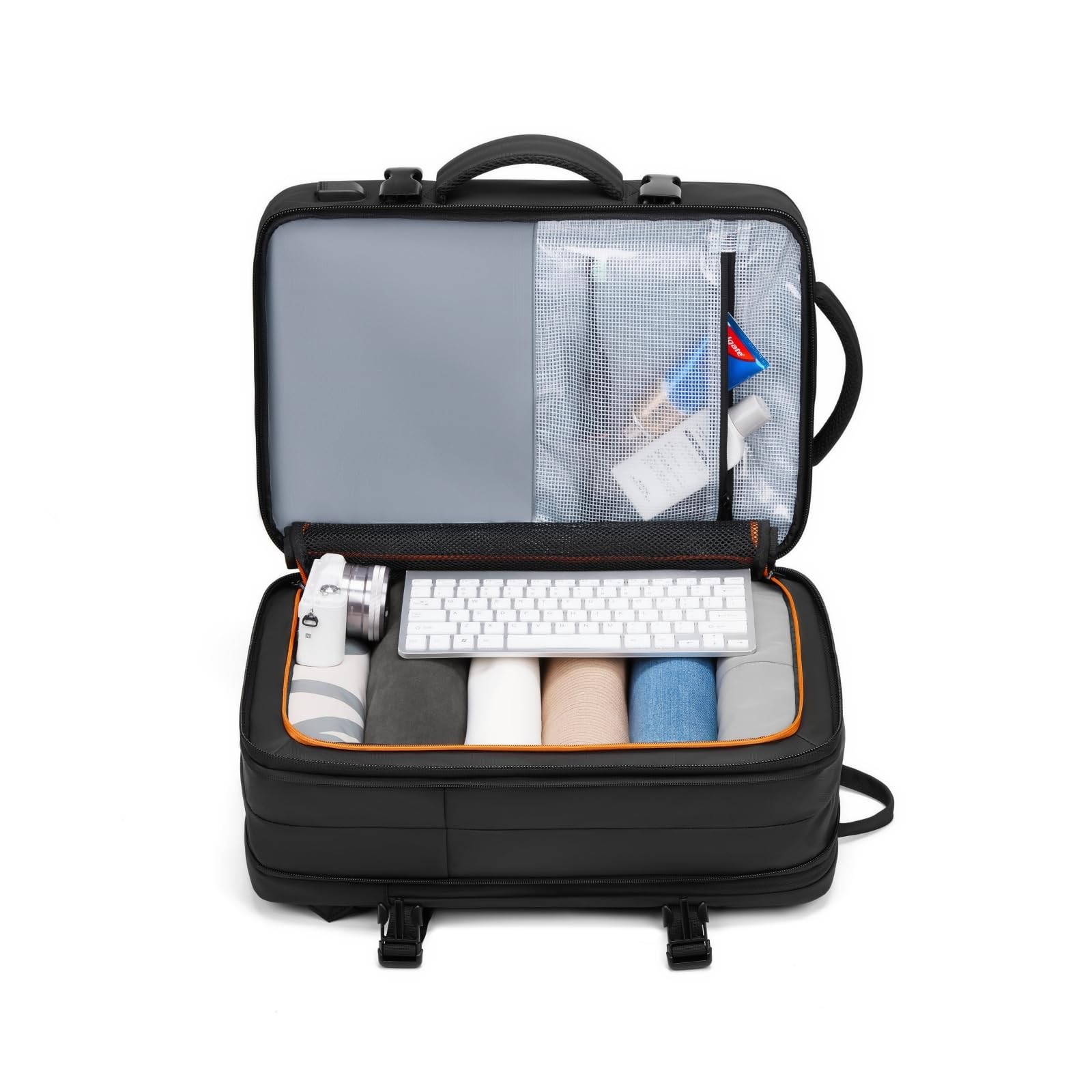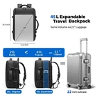 Travel Backpack is designed to make traveling simpler and more efficient. This innovative backpack maximizes your packing space while keeping your belongings organized and secure. Whether you're traveling for business or leisure, the expandable design accommodates everything from laptops to travel essentials. Its water-resistant material ensures durability in all weather conditions, and the USB charging port allows you to stay powered on the go. Ideal for airplane travel, this multifunctional backpack features a sleek, modern design that combines practicality with style, offering the ultimate convenience for travelers and professionals alike. Expandable Capacity: 25L-45L: Adjust the size of your backpack to meet your travel needs. In standard mode, the backpack holds 25L (18.9x12.6x6.7 inches); expand it to 45L (18.9x12.6x11.4 inches) for extra packing space. Ideal for 5-7 day trips. [Convenient USB Charging Port]: Stay powered on the go with the external USB port and built-in charging cable. Simply connect your power bank to charge your devices anywhere. The hidden anti-theft pocket on the back provides secure storage for valuables like passports and wallets. [Durable & Waterproof Design]: Crafted from water-repellent fabric and anti-scratch material, this backpack keeps your items dry and safe in light rain. Breathable mesh padding on the back and adjustable shoulder straps offer comfort and reduce shoulder strain. [Airline Approved & Quick Access]: Meets airline carry-on size regulations, fitting under the seat or in the overhead bin. The 180° zipper design allows fast and easy access during security checks, making your travels more efficient. [Laptop & Travel Gear Storage]: Features a separate laptop compartment (18.5x11.8 inches) that fits a 17.3" laptop, plus a spacious main compartment for 5-7 days of clothing and essentials. Perfect for business trips, weekend getaways, and daily commutes. (Not for children under 12 years old.)