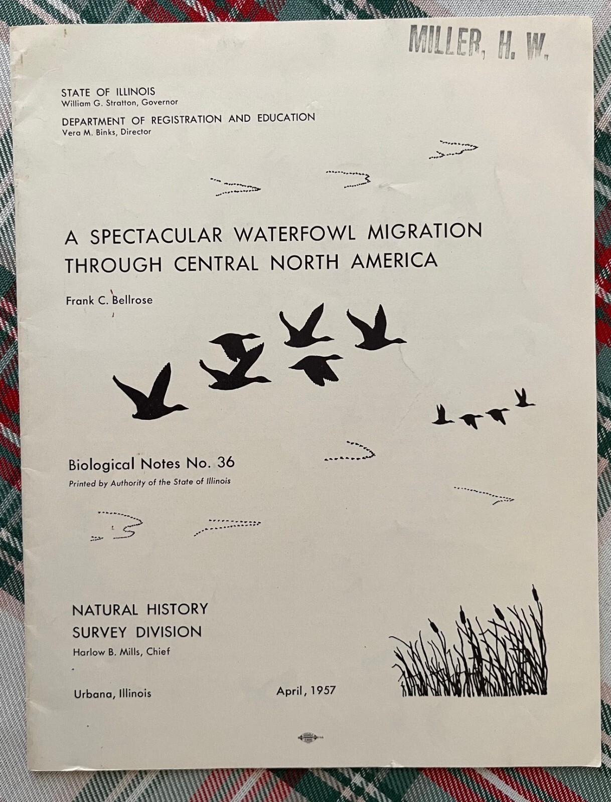A spectacular waterfowl migration through central North America, 1957. Author is Frank C. Bellrose. Illinois Natural History Survey, Biological Notes No. 36. Paperback, Staple Bound. 24 pages. A waterfowl conservation classic. Nice condition. There is a name stamp on the front cover. Some wear (rubbing, mild staining) to the front and back cover. There is a small tear near the bottom center of the front cover and mild bending to the outer bottom corner. If additional books are purchased, I will gladly combine all into one shipment to reduce postage costs. Savings on postage will be returned to the buyer. Note that there is an additional Frank Bellrose publication listed.