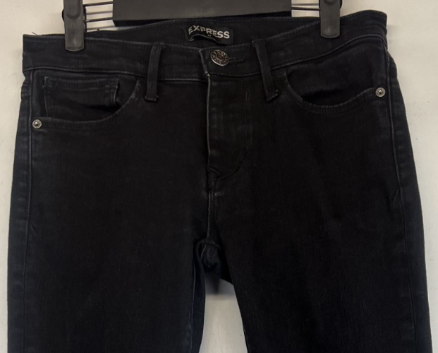 The product is a pair of Express Jeans in women's size 6, featuring a sleek black color with a mid-rise fit. These leggings are made from a blend of polyester, spandex, and cotton, offering stretch and comfort. They feature a five-pocket design, zip and button closure, and come in a 29.5-inch inseam. Perfect for all seasons, these jeans are versatile and easy to care for, making them a stylish and practical addition to any wardrobe. Very good preowned condition with normal preowned wear. Please see all photos; specifically for measurements. ******************************************************************************************************************************************************* FOR CLOTHING SPECIFICALLY, BE SURE TO REVIEW PHOTOS FOR ACTUAL MEASUREMENTS OF THE WAIST, RISE, INSEAM, LEG OPENING, SHIRT WIDTH AND LENGTH, ETC... WASHED CLOTHING TENDS TO SHRINK SLIGHTLY AND THEREFORE MAY DIFFER SLIGHTLY FROM WHAT THE TAG/SIZE SAYS THAT IT IS. ******************************************************************************************************************************************************* The size in the title is the size on the tag of the garment. See photos for measurements of actual measurements as they may differ. ALWAYS CHECK THE MEASUREMENTS IN THE PHOTOS. This will remove any questions on measurements as well as always cover the possibility of human error in the listing(s) in the case of a typo or oversight. All clothing and shoes have been washed/cleaned, and are cleaned and stored in a smoke free environment. However, please keep in mind that these are preowned items and there is always a possibility of there being preowned dirt, dust, or stray hairs present. I do my best to clean these items with hair collecting products in the dryer after being washed, and by hand with shoes. If shoe trees appear in the photos, they are for photography purposes only to illustrate how the shoes look filled out, and are not included. I accept or negotiate reasonable offers. If you like what you see here, please visit my eBay store for many, many ore items similar to this one. I hope to see you there. For your convenience you can simply copy & paste the link below to go directly to my store. https://www.ebay.com/str/projectellsworth Have an amazing day. Thank you. FOR CLOTHING SPECIFICALLY, BE SURE TO REVIEW PHOTOS FOR ACTUAL MEASUREMENTS OF THE WAIST, RISE, INSEAM, LEG OPENING, SHIRT WIDTH AND LENGTH, ETC... WASHED CLOTHING TENDS TO SHRINK SLIGHTLY AND THEREFORE MAY DIFFER SLIGHTLY FROM WHAT THE TAG/SIZE SAYS THAT IT IS. *******************************************************************************************************************************************************