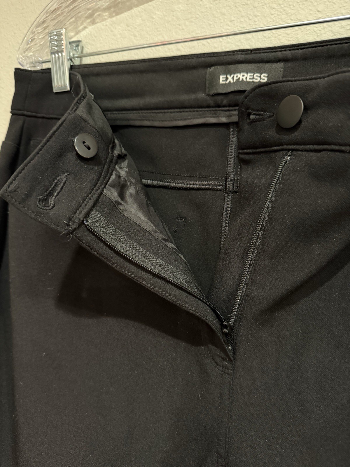 These Express Women's Pants in size 12 and regular fit offer a classic and elegant style perfect for various occasions. The black polyester blend fabric with a mid-rise and bootcut leg creates a sleek and sophisticated look. Featuring a zip, button, and hook & eye closure, these pants are comfortable and easy to wear. The stretch feature ensures a flattering fit, while the 30-inch inseam and flat front design make them versatile for both casual and formal settings. Perfect for any season, these pants are a wardrobe staple for the modern woman.