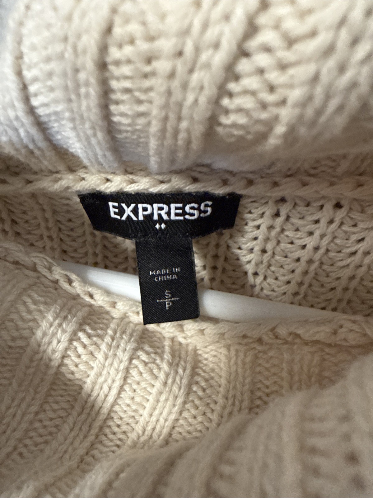 The product is a cream-colored women's sweater from Express in size small. It is a solid patterned long sleeve pullover sweater made of knit fabric, suitable for casual occasions during the winter, fall, and spring seasons. The sweater is machine washable and features a regular fit, making it a versatile and comfortable option for everyday wear. Made in China, this sweater is a stylish and practical addition to any woman's wardrobe.