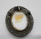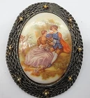 This exquisite vintage Victorian brooch is a one-of-a-kind jewelry piece that will surely become the highlight of your collection. The brooch features a stunning oval main stone with multicolor hues, and it is accented with painted vintage details. The item is 2in long and has a beautiful bezel setting style. This brooch is perfect for women who love fashion and vintage jewelry. It is an original piece that comes with a signed Fragonard jewelry pendant. The brooch is pre-owned and has a vintage appeal that will add a touch of elegance to any outfit. Normal wear as seen in pictures. Get this timeless piece today and complete your jewelry collection.