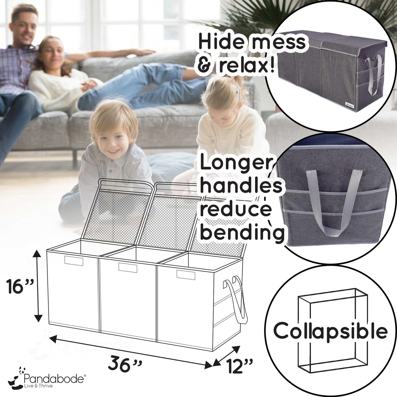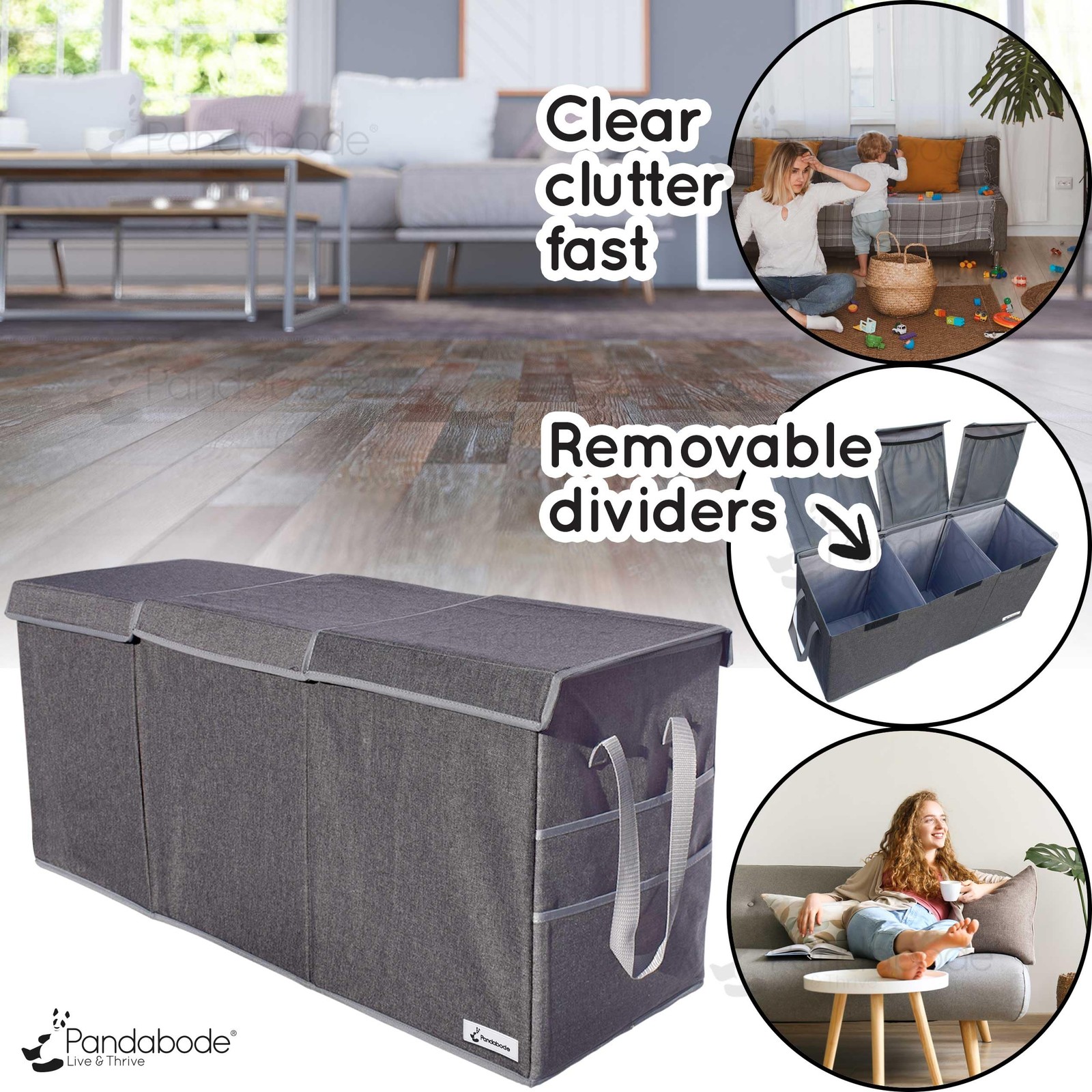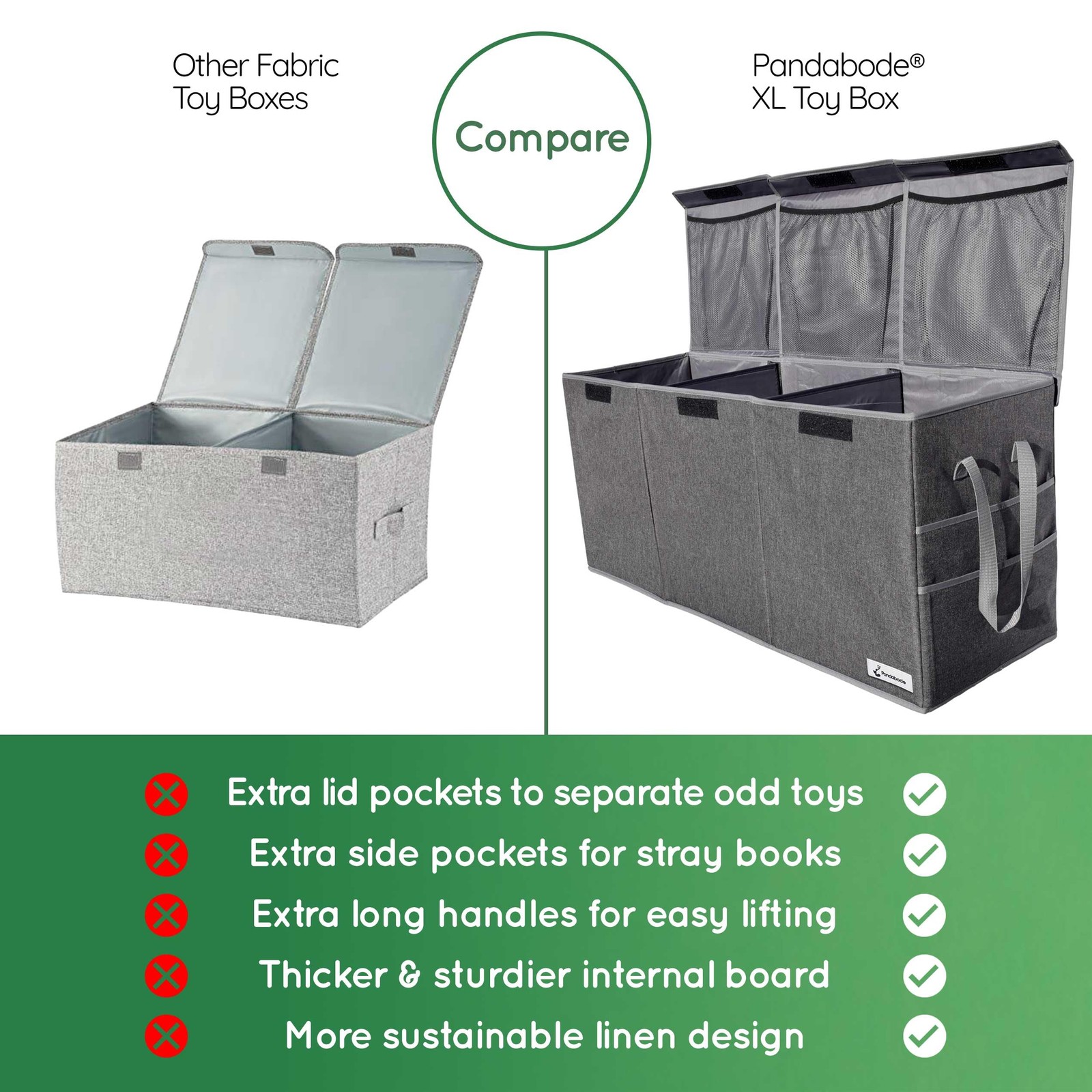 Our extra large kids toy box is a huge toy chest, designed to keep your living room clutter-free. Our XXL toy box sorts and organizes toys into a stylish extra long toy box, to transform your living room. With big storage bins toys are out of sight. This extra large toy storage box has 3 huge toybox compartments. Dividers are removable, to make a single extra large toy storage bin. With this configuration of the toy box extra large items can also fit. With any toy box for living room area extra large toys need to be out of sight too. Our extra large toy box storage solution is useful for apartments, because with this toy box large storage racks can go. Also despite the toy box xl size, it is still collapsible. When it comes to toy storage collapsible chest options can be super handy because they can be put away, when you get rid of unused toys, but reassembled after Christmas! With a toy chest collapsible large and study, to hand, clutter never wins! With this kids toy box big messes are manageable. 3 x pockets are hidden under the xlarge toy box lids. Stash little bits and bobs, within the same huge toy box storage solution, without getting lost in the deep XXL toy storage compartments. Having such a large storage box for toys, with pockets, makes organization, light work. With this toy bin extra large and tiny items stay separated. With the side pockets on the big toy chest extra large width kids books, can be stashed. With our toy box large or stray books have a home. Our sturdy xxl toy bin withstands everyday heavy duty use. With this kids toy chest large or bulky toys can all be stored and carried. Thanks to the 2 long handles on each side of the toy box huge amounts of toys can be picked up and moved easily, minimising bending. Extra large storage for toys must resist scrapes and bumps. That's why our huge toy storage bin uses thick durable, fabric. The ultimate Toy storage box large / Toy box with lid large. Easily sorts and stores your children's toys into a plush yet discreet grey toy box, to transform your living room back into a tidy, calm oasis. We need to give ourselves those breaks when we can! Our extra large toy storage box has 3 giant storage bins, removable dividers, plus extra internal pockets. It's also fully collapsible and needs minimal space folded away. 3 x Stretchy mesh pockets are hidden under the big toy chest lids, out of sight when the lids are closed. Now you can stash all those frustrating little bits and bobs, within the same huge toy box storage solution, without getting lost at the bottom of the large toy bin compartments. Our XL Toy storage chest makes organization, light work. Save time, clear clutter, then take a moment to smile at how calm and organized you now feel. Go you. 2 handy slide pockets on the side, to help you rapidly tuck away abandoned story books, colouring and puzzle books. With our bottomless toy box large or small items are hidden away with ease. Big toy boxes for kids extra large size, are a hassle-free way to get an entire room cleared away into a single jumbo toy chest, fast. Our sturdy xl toy box is built to withstand everyday use. Reinforced handle stitching and tough fabric resist scrapes and bumps, ensuring a long-lasting durable, extra large toy bin. Our kids large toy box uses an eco conscious linen material design. The storage chest uses majority sustainable materials from natural sources such as flax plant and wood.