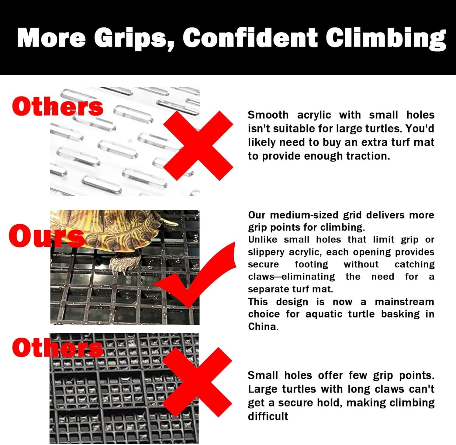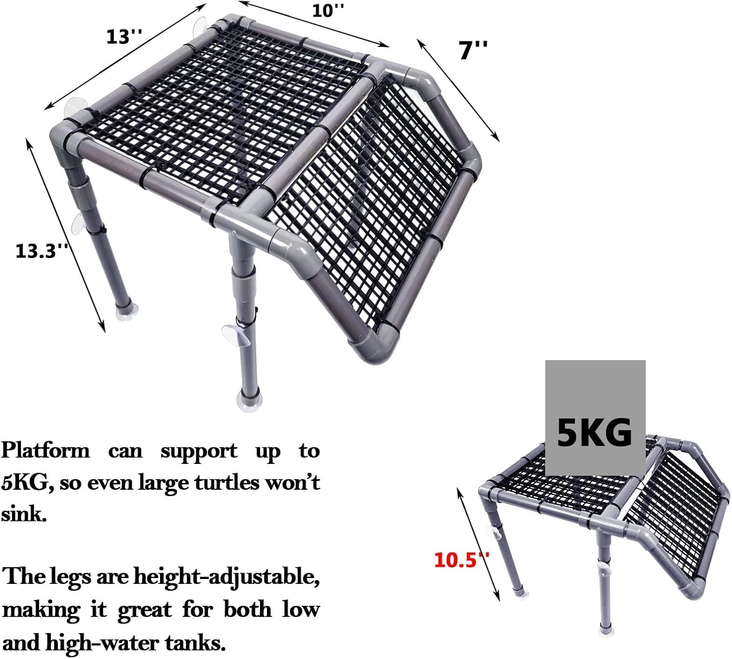 About this item SPECIFICATIONS:This large turtle basking platform is one of the essential turtle tank accessories for medium to large aquariums. It fits tanks that are at least 14 inches wide and 19 inches high, providing your turtle with plenty of space both above and below the basking area. This turtle basking platform large is compatible with 50, 70, 75, and 125-gallon tanks. Be sure to measure your tank to ensure compatibility before purchasing.We intentionally leave a small gap between the platform and the tank wall to prevent over-tightness, so some space between the tank and the product is normal.Only the height of this product has two options; other dimensions are fixed STABLE & SECURE:The aquatic large turtle basking platform features at least 8 suction cups on the bottom and sides to ensure a firm hold against the tank glass. It stays stable and secure, so your turtle can bask with confidence. Even heavier turtles won’t cause it to sink. Each large turtle basking platform comes with extra suction cups as backups for added reliability HOW TO USE:Turtle behavior varies depending on species and age. Some shy turtles may climb onto the turtle basking platform large only when you’re not around or after lights are off. To help them get comfortable with the new turtle tank accessories, you can guide them by placing food near or on the platform until they become familiar with basking there.If you find the legs of the basking platform too high, you can purchase a PVC pipe cutter separately to trim the pipes. Our pipes have a diameter of 2cm, so please choose a pipe cutter that is compatible. NOTICE:Each of our aquatic turtle docks for basking is handcrafted, so slight variations in height (under 1 inch) may occur. These minor differences don’t affect function—your turtle will still enjoy sunbathing comfortably on the large turtle basking platform. Please check your tank’s water level before purchasing to ensure compatibility. The water level should not fall below the minimum recommended height CLIMBING RAMP:This turtle basking platform large is built using high-quality PVC pipes, couplings, and a durable plastic platform. The 45° climbing ramp is designed with holes and textured grips to help turtles of all sizes climb easily. It’s one of the most reliable and easy-to-clean turtle tank accessories you can add to your setup.The product is better suited for turtles and tanks larger than those shown in the videos and photos, and not for very small turtles. The visuals are only to show product details. INSTALLATION TIP:For best results, place the large turtle basking platform inside your tank before adding water. This prevents it from floating and makes installation easier. Always verify your tank’s water level and dimensions before use to ensure the turtle basking platform large fits securely and functions properly Color: Gray Brand: Theme: Aquatic Turtles, rampa para tortugas de agua, red ear tortuga ramps Material: PVC pipe, plastic grate Style: shanding You may also like PG1202SA 1200 Peak Watt 900 Running Watt Portable 2-Cycle Gas Powered Generator 282.29 USD 300.31 USD Free shipping 6% off Full Size Garment Steamer with Telescopic Pole Foldable Hanger 70 Oz. Water Tank 115.48 USD Free shipping 12V Max* Lithium-Ion Cordless Impact Driver with 1.5Ah Battery and Charger 55.56 USD 64.73 USD Free shipping 14% off 12 Can Capacity Welded Cooler Heavy Duty Waterproof Adjustable Shoulder Strap 71.49 USD Free shipping Interior Exterior Clear-Seal Gloss Sealer-607001 low-odor low-VOC DIY , Gallon 64.3 USD Free shipping 20-Volt Cordless 4 1/2-inch Angle Grinder Kit 20-Volt 4.0Ah Lithium-Ion Battery 218.3 USD Free shipping 100W CD Stereo W/USB & BT Connectivity Bluetooth Wireless Tray-loading CD Player 178.58 USD Free shipping Spred Grab-N-Go Interior Wall Paint Storm's Coming / Grey Semi-Gloss 1 Gallon 47.57 USD Free shipping Set of 4 Glass Food Storage Containers Leak-proof Seal Airtight W/ Latching Lids 65.98 USD 74.48 USD Free shipping 11% off 3 Pack Pine Wood Pet Bedding Freshall-natural Scent Triple-screened for Chickens 39.68 USD 43.18 USD Free shipping 8% off 20 Piece Nonstick Cookware Set Pots Fry Pan Dishwasher Safe Jumbo Cooker Griddle 166.2 USD Free shipping Spred Grab-N-Go Interior Liquid Wall Paint Storm's Coming / Grey Flat 1 Gallon 37.37 USD Free shipping