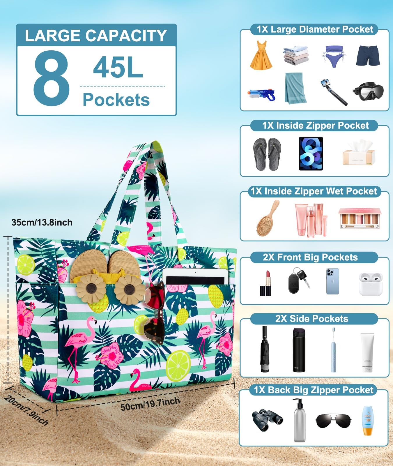 Beach Bag for Women with Zip - Your Ultimate Companion for a Day at the Beach Multiple Pockets and Large Capacity This zipped beach bag has multiple pockets: 1 main big compartment for clothes or towels, 1 inner zipper pockets to the valuables, 1 inner zippered pocket for wet clothes, 2 front pockets for small items, 1 large zipper back pocket and 2 side bottles holder for beach items. The large capacity ensures that you can carry all your beach necessities with ease. Functional and Stylish The beach tote bag features a secure top zipper closure that effectively keeps your items dry and safe. With the reinforcement straps, you can carry the beach bag with zipper by hand or comfortably wear it over your shoulder without worrying about tearing. Moreover, its fashionable design and vibrant colors not only make it a practical accessory but also add a touch of visual appeal, ensuring you stand out on the beach. Premium Quality Material Crafted with premium materials, our mens beach bag is waterproof, ensuring that your belongings stay dry even in wet conditions. The sandproof feature prevents sand from sticking to the bag, making it easy to keep clean. Its durable construction guarantees long-lasting use, allowing you to enjoy countless beach trips. Suitable for Various Scenarios Our waterproof beach bags for women is the perfect companion for various occasions, such as beach family time, pool parties, picnics, shopping, and travel. Its compact and lightweight design allows for easy folding and storage in your backpack or luggage, ensuring convenient portability wherever you go. Specifications: Material: High-quality, waterproof fabric Size: 19.7 x 13.8 x 7.9inch Weight: 500g Package Includes: 1 x Foldable Beach Bag If anything puzzles you about the page, please feel free to our after-sales . It is our pleasure to provide you with the best service! š¬ćLarge Storage SpacećThis beach bags allows you to conveniently pack all your outdoor essentials, such as 2 or 3 beach towels, clothing, a wallet, swimming gear, beach toys, water shoes, sunglasses, water bottles, and still leaves room for more. The beach bag with zip has a capacity of 45L and features 8 pockets: 1 large pocket, 5 external pockets, 1 internal zipper pocket and 1 internal zipper wet pocket. Equipped with a zipper closure to ensure your belongings won't accidentally fall out. šļøćWaterproof and DurablećCrafted with durable 600D fabric and eco-friendly EVA composite material. Offers excellent protection against water, sand and scuffs, and the water-repellent coating effectively protects your items. The inner lining of the large beach bag is made of brushed fabric, which provides a soft and comfortable touch. It possesses moisture absorption, breathability, and promotes air circulation, ensuring the contents inside stay dry and unaffected by dampness. š“ćWet and Dry SeparationćThe internal zipper pocket is specially designed for separating wet and dry items. The waterproof beach bag features a dedicated waterproof compartment inside the pocket, and the zipper closure ensures that the pocket is effectively sealed and prevented moisture from seeping in or out. This provides optimal protection to keep your important belongings dry. Additionally, we have enlarged the zipper pocket to better help you separate more dry and wet items. šćFashionable AppearancećWith exquisite design and excellent workmanship, the summer beach bag pattern is stylish and eye-catching. Its beautiful and colorful pattern is sure to catch attention and is a perfect complement to your summer style. The sturdy yet soft rope strap ensures effortless carrying and can be easily adjusted to your liking. Whether you prefer carrying it by hand or slinging it over your shoulder, this zipped beach bag offers both convenience and style. šćMultifunctional UsagećOur oversized beach tote bag is a versatile companion for various occasions, including family beach time, pool parties, picnics, and shopping. It effortlessly adapts to your needs, doubling as a travel bag, gym bag, pool bag, sports bag, and even a carry-on luggage handbag for traveling. Notably, its compact and lightweight design allows for easily folded and conveniently stored in your backpack or luggage case.