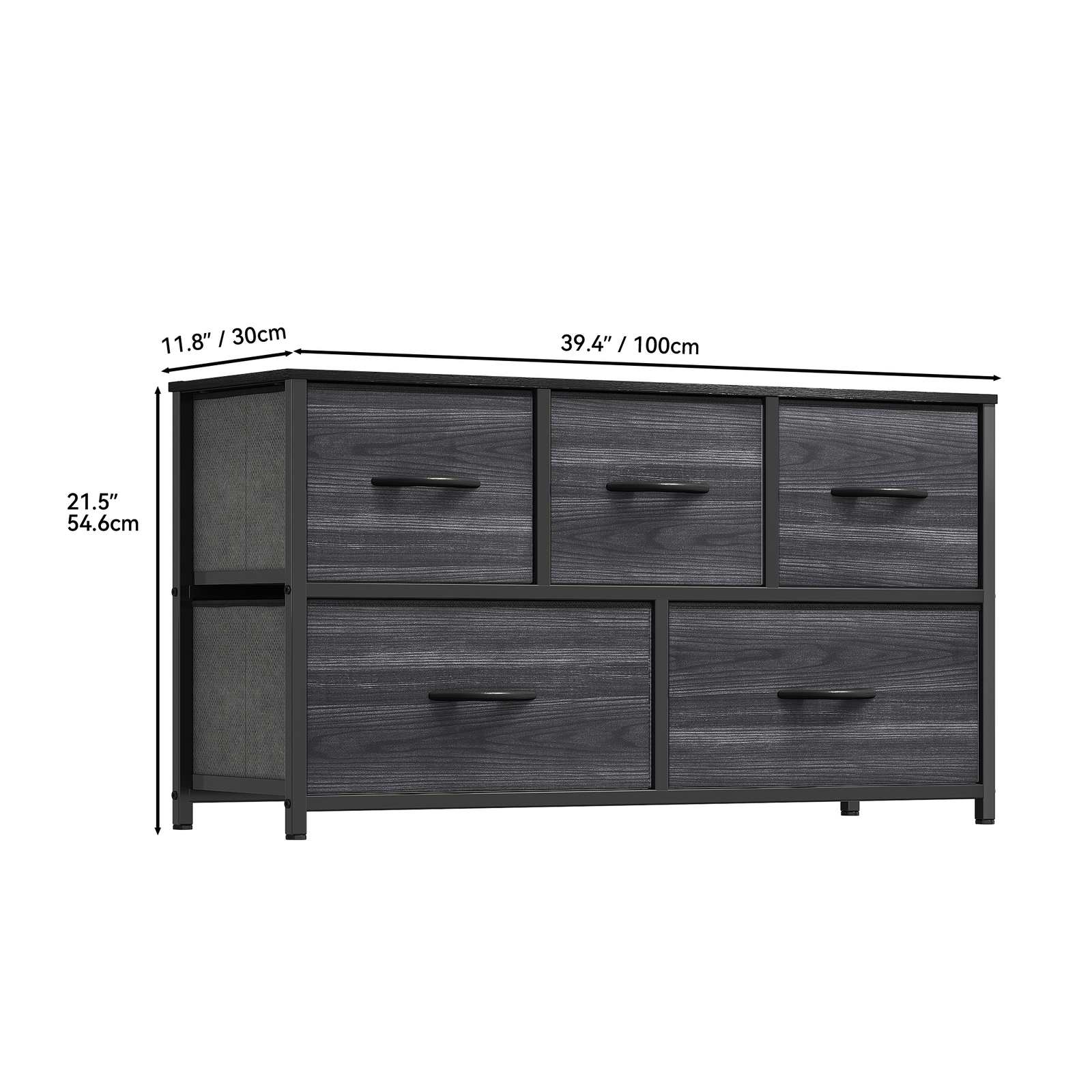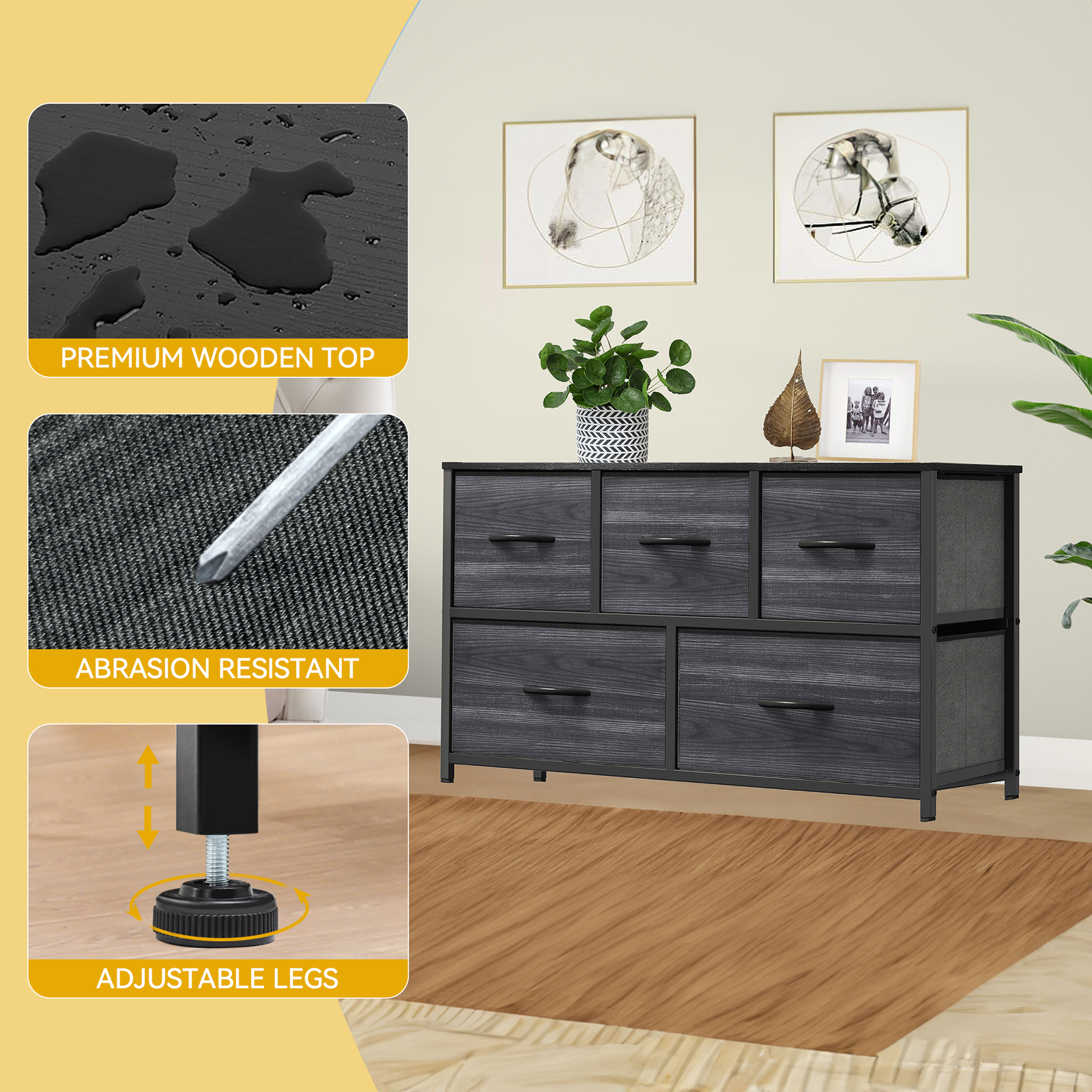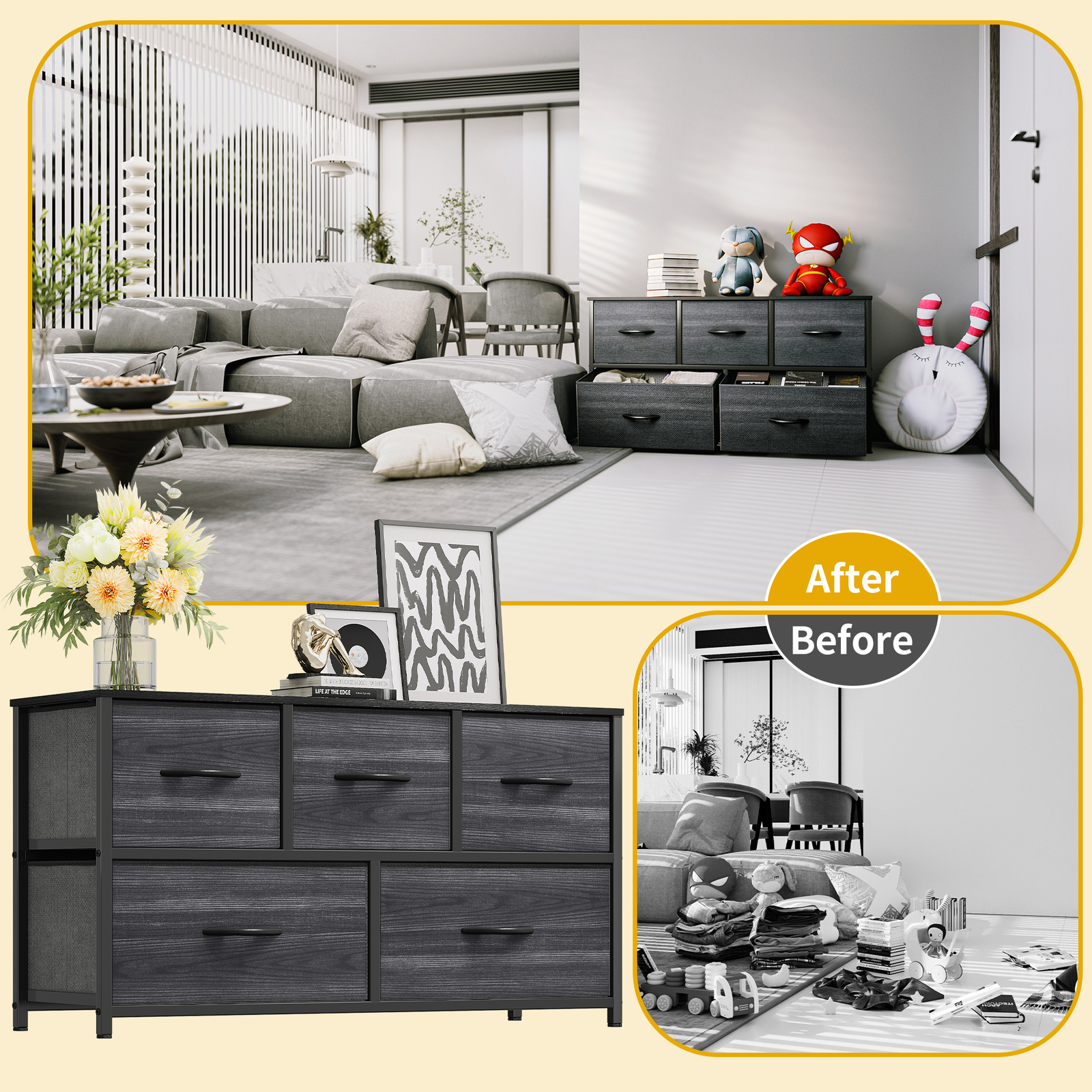 Product Description Specifications: Material: Wood, Medium density fibreboard, Iron, Metal, Steel, Fabric Product Dimensions: 39.4"D x 11.8"W x 21.5"H Number of Drawers: 5 Color: Charcoal Black Wood Grain 1. High-quality wooden boards, Wood top provides a hard surface to place cups, lamps, books and etc. 2. Modern technology, suitable for most decoration styles; easy to assemble; maximum load: 70lbs. 3. Screw-in leveling feet adjust easily on uneven ground and protect the floor from scratches. Package Included: 1 x 5-drawer dressers 1 x Assembly hardware kit Please Note: 1. Please feel free to contact us if you have any concerns. 2. Fixing the fabric dresser to the wall is well recommended. Please follow the instructions. Product Details QUALITY CONSTRUCTION Made from reliable metal frame and durable MDF wooden top; 5 removable and foldable drawers; Easy-pull wooden handles allow drawers to be conveniently opened and closed; 4 adjustable plastic feet protect your floor from scratches. DURABLE FABRIC The front material is made from high quality Cationic fabric and the others manufactured from breathable non-woven synthetic fabric; Easy maintenance, just wipe clean with a damp cloth and let air dry . EASY ASSEMBLY Detailed instructions and installation video will guide you through a hassle-free installation; All hardware is included in the package so you only need to fasten some screws. UNIVERSALLY COMPLEMENTARY Premium cool grey fabric drawers with sturdy black metal frame and wooden tabletop; Enjoy modern scent and stylish aesthetics that easily complements various living spaces: living rooms, bedrooms, hallways, entryways, closets and nurseries, etc. Shipping 1.The shipping rates listed are only for residential or commercial destinations in the continental 48 United States. All international sales will go through eBay Global Shipping Program.please ask us if there are any questions. 2.We only ship the item to the address that is sent to us at the time of checkout. Please verify the correct shipping address in your PayPal account before making your payment. If we ship your item to an old or invalid address and you are not able to locate the item, we are not responsible for shipping a replacement. 3.Currently, we do not ship to Hawaii, Alaska, Puerto Rico,APO/FPO/PO Boxes. 4.We use USPS, UPS & FedEx as shipping method. 5.Payments cleared before 12 PM PST, will be shipped on the same day. Payment 1.We accept PayPal and all forms of credit card. 2.We will only ship to the confirmed Paypal shipping address given with the payment. 3.We do not offer local pick up service. Return 1.30 days Money Back Guarantee. 2.If any package that needs to be returned, please contact our customer service first to receive a RMA form. 3.All return items MUST be in brand new condition. About Us 1.Specialized in aftermarket auto parts since 2012, we source and work directly with professional manufacturers to provide the highest quality parts at the most economical prices. 2.We also has over 5 years of shipping experience with FedEx and USPS . Our Packing Quality is Guaranteed , Item Ship-ping is timely! On Dec 15, 2023 at 09:34:01 PST, seller added the following information: