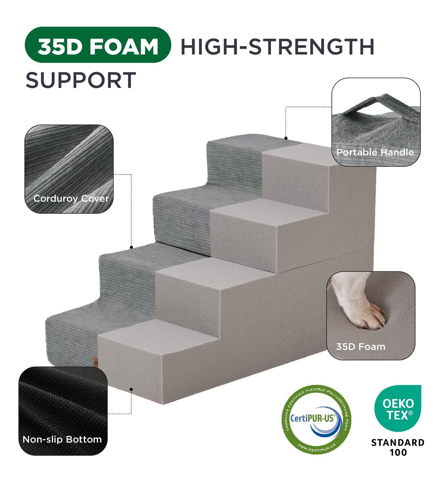 Made4Pets Dog Stairs for Small Dogs, Extra Wide Dog Steps for Bed Couch Sofa and Chair, 35D Foam Pet Steps for Small Dogs and Cats, Non-Slip Bottom Pet Stairs, Grey, 3 Steps Product Details Color: Grey Number of Layers: 3 Size: 21"x15.7"x13.5"H Brand: MADE 4 PETS MPN: MAWW0197GY UPC: Does not apply EAN: Does not apply Brand: MADE 4 PETS Material: Corduroy Color: Grey Assembly Required: No Number of Layers: 3 Package Dimensions : 16.89 x 8.58 x 7.52 inches; 5.27 Pounds Item model number : MAWW0197GY Date First Available : November 28, 2024 Manufacturer : Made4Pets Country of Origin : China Best Sellers Rank: #9,625 in Pet Supplies (See Top 100 in Pet Supplies) #7 in Cat Stairs & Steps #33 in Dog Stairs & Steps #7 in Cat Stairs & Steps #33 in Dog Stairs & Steps Customer Reviews: 4.5 4.5 out of 5 stars 281 ratings Dog Breed Size: Medium Manufacturer: Made4Pets Item Weight: 5.26 pounds Country of Origin: China Item model number: MAWW0197GY Date First Available: November 28, 2024 Item Package Dimensions L x W x H: 16.89 x 8.58 x 7.52 inches Brand Name: MADE 4 PETS Target Audience Keyword: Cats, Dogs Directions: for pets Warranty Description: 1 Year Model Name: MAWW0197GY Size: 21"x15.7"x13.5"H Included Components: Dog Stairs Specific Uses for Product: Indoor Comfortable & Accessible - Made4Pets foam dog stair provides a safe and easy way for your furry friends to access their favorite spots, whether it's the bed, couch, sofa or car. Perfect for small and medium dogs, these stairs offer comfort and stability for pets with joint issues or seniors who struggle to jump Multiple Step Options - These pet stairs come in 3, 4, and 5-step versions to fit your needs. The 3-step is ideal for low couches or beds (up to 18"). The 4-step is better suited for medium-height furniture (up to 23"), and the 5-step helps pets easily reach higher beds or cars (up to 27") High-Quality & Sturdy - Made with 35D high-density foam and eco-friendly material, this doggie steps is both lightweight and durable. The non-slip rubber dots on the bottom provide extra grip, preventing any slipping or shifting while your puppy climbs up or down Easy to Maintain - The removable cover is machine washable, making it easy to keep the stairs clean and fresh. Simply remove the foam core before washing. Note: Allow the foam to fully expand (24-48 hours) after unpacking to ensure maximum comfort and stability Versatile & Foldable - Not just for climbing! 4, 5-step(not 3-step) can be folded into a cozy pet bed for naptime. Ideal for dogs, cats, or pets with mobility challenges, this versatile product helps reduce joint strain and offers a practical solution for everyday comfort and convenience