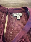 This Eyeshadow Plum Lace Blouse in size S features a high neckline, long sheer sleeves, and elegant lace accents throughout the polyester blend fabric. The blouse is lined for added coverage and can be machine washed. Perfect for various occasions such as travel, weddings, parties, casual outings, workwear, or formal events, this Victorian-inspired piece exudes a touch of gothic charm with its rich purple color and intricate lace detailing.