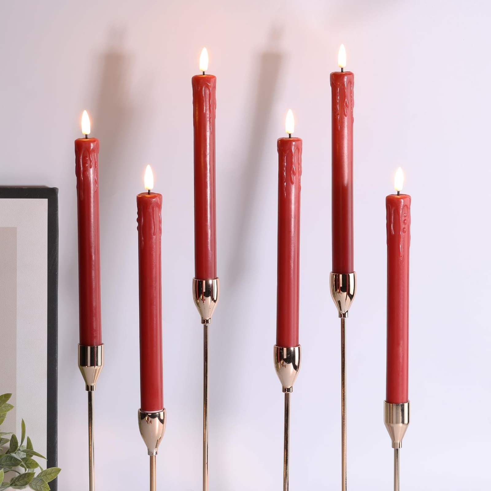 Eywamage Red Christmas Flameless Taper Candles with Remote, Realistic Dripping Wax Battery LED Candlesticks Set of 6 Product Details Color: Red Brand: Eywamage MPN: MA015-S6-Red UPC: Does not apply EAN: Does not apply Finish Type: Coated Product Dimensions: 0.86"D x 0.86"W x 5"H Lamp Type: Mood Light Shade Color: Red Shade Material: Plastic Finish Type: Coated Product Dimensions: 0.86"D x 0.86"W x 5"H Lamp Type: Mood Light Shade Color: Red Shade Material: Plastic Switch Type: Remote Style: Modern Brand: Eywamage Color: Red Special Feature: Cordless Light Source Type: LED Material: Paraffin Wax + ABS Room Type: Bathroom, Kitchen, Living Room, Bedroom Power Source: Battery Powered Number of Light Sources: 6 Included Components: 6 piece led taper candles, 1 remote and user manual Is Waterproof: false Mounting Type: Tabletop Wattage: 6 watts Number of Items: 6 Lighting Method: LED Indoor/Outdoor Usage: Indoor Number of Pieces: 6 Voltage: 3 Volts Is Cordless?: Yes Manufacturer: Eywamage Shade Height: 5 Inches Part Number: MA015-S6-Red Item Weight: 1.15 pounds Item model number: MA015 Batteries: 1 CR2 batteries required. Finish: Coated Special Features: Cordless Batteries Included?: No Batteries Required?: Yes Date First Available: August 24, 2024 Unique Tear-drop Design: stand out with these electronic taper candles featuring a distinctive dripping-wax shape, adding a modern twist to traditional candle aesthetics Rich Dark Red Hue: our dark red LED taper candles offer an elegant ambiance, perfect for adding a touch of timeless elegance to your home decor or festive celebrations Battery Powered & Long Battery Life: each taper candle takes 2 AAA batteries (not included), lasting over 350 hours; remote takes 1 cr2025 coin cell ( included) Convenient Remote & Timer Function: effortlessly control the ambiance with the included remote, allowing you to control power, adjust brightness, set timers, and choose from various flicker effects at the touch of a button within 20 ft Safe & Versatile Application: these flameless taper candles provide a safe and hassle-free alternative, ideal decor for home, Christmas, wedding party, events, also wonderful gift