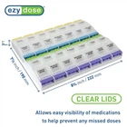 Ezy Dose push button and organizer and Planner (extra large) - 7-Day and 4 times a day Planner - This Weekly Organizer is perfect for Scheduling frequent doses of your week's . Its push buttons and transparent lid are simple To use and help you keep track of your through the Week. This Weekly Planner is designed for easy use. Its buttons make it simple to open lids and retrieve medications. Each day has 4 compartments for planning frequent daily doses. The product's clear lid allows easy visibility of to help prevent missing doses.. The main features of the Weekly Planner include:.Easy use - push buttons and make the planner simple to open and easy to retrieve. Daily 4-Dose Reminders - Easily plan your frequent daily doses clear lid - allows visibility of medications to help prevent any missed doses large compartments & non-skid bottom - the planner can fit 30 aspirin and has plenty of room for all of your daily medications. Non-skid bottom keeps Planner in place. Product dimensions 8-5/8 x 7-1/2 x 1 inches Product Recommended by the Arthritis Foundation and is great for anyone with dexterity problems! About Ezy Dose: Ezy Dose is the leader in easy-to-use management products. Many of our push-button planners are endorsed by the Arthritis Foundation for our ease-of-use design. Ezy Dose products make living healthier simply easier with products like cutters, crushers and a full line of easy-fill planners. 7 DAY ORGANIZER: AM/PM compartments help you to easily plan and distribute your daily doses EASY USE: Keep visible and help prevent missed doses CAPACITY: Holds up to 30 per compartment (aspirin-sized) BUILT TO LAST: Quality design, Built to withstand repeated use. Care Instructions- Wash prior to first use with mild soap and water. Rinse. Dry before using HEALTHY LIVING: Ezy Dose products make living healthier simply easier, many products Arthritis Foundation Certified