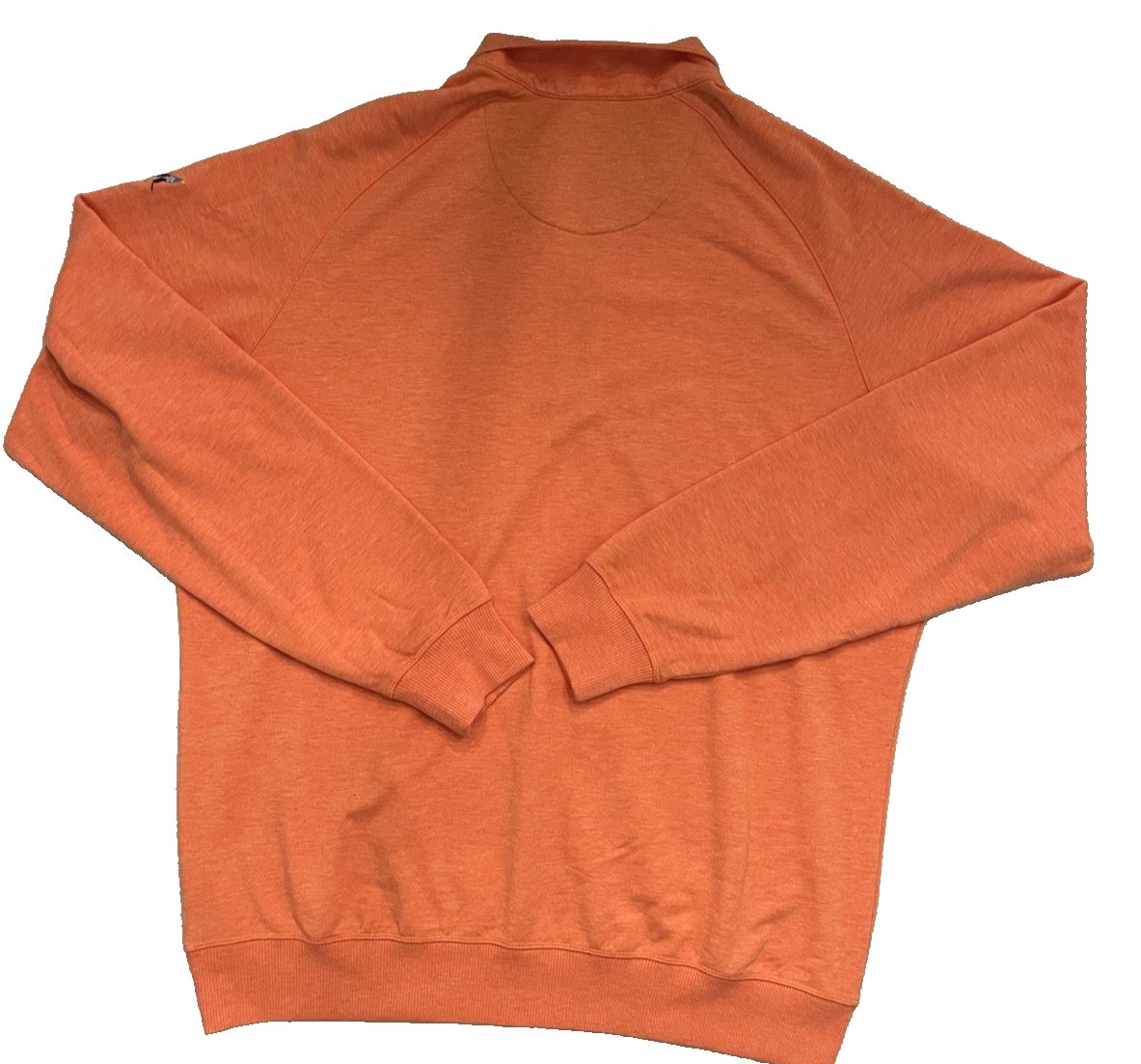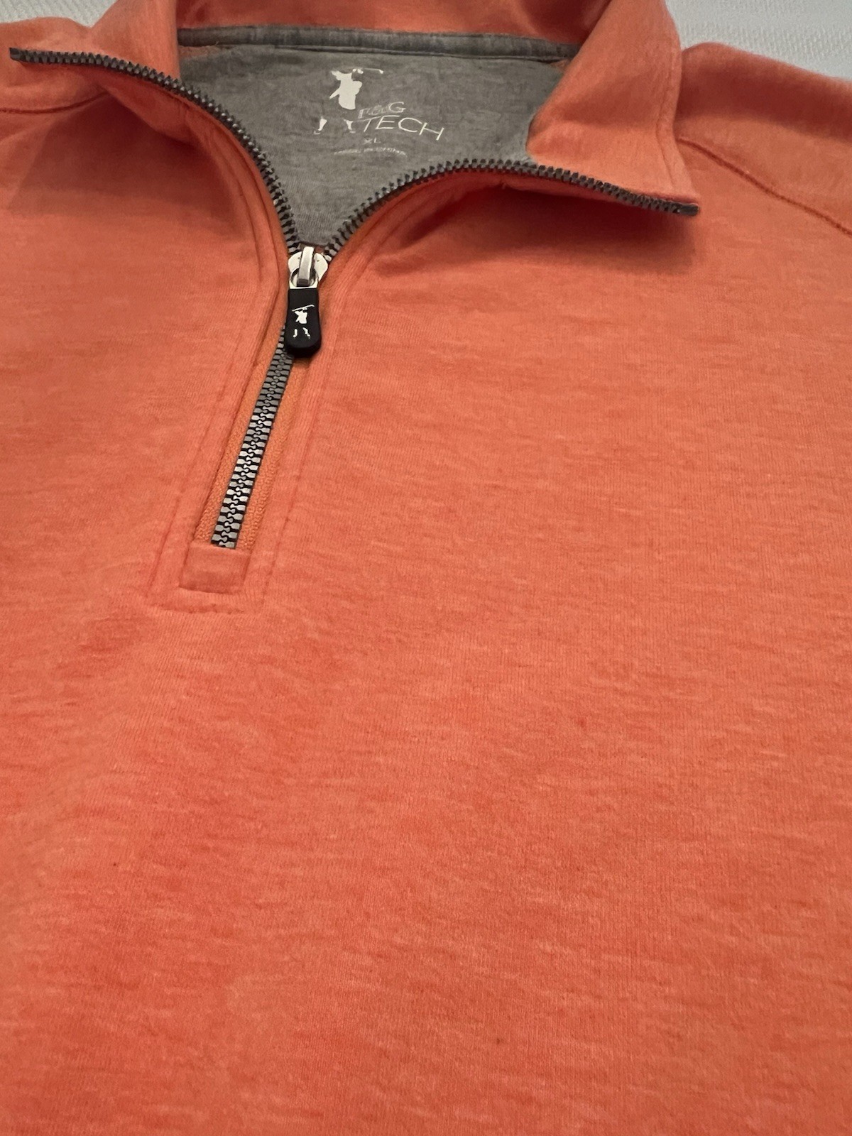The F & G Tech Coral 1/4 Zip Pullover is a luxury men's golf shirt in size XL, featuring the iconic golf club logo. This stylish pullover is perfect for various occasions such as golfing, casual outings, or country club events. Made from a blend of polyester and spandex, it offers features like easy care, stretch, moisture-wicking, and breathability. With a stand-up collar and long sleeves, this pullover provides both style and comfort for the modern golfer.