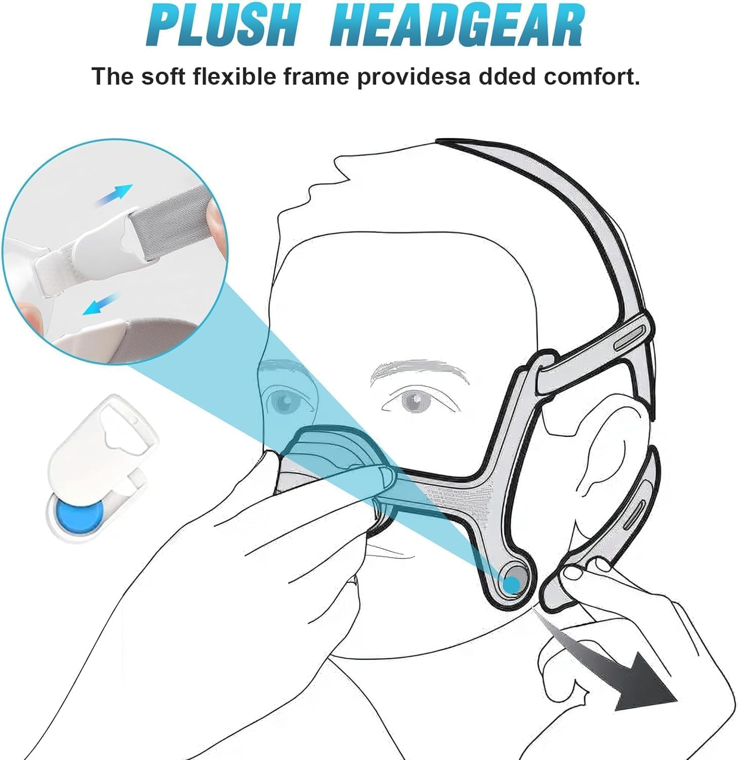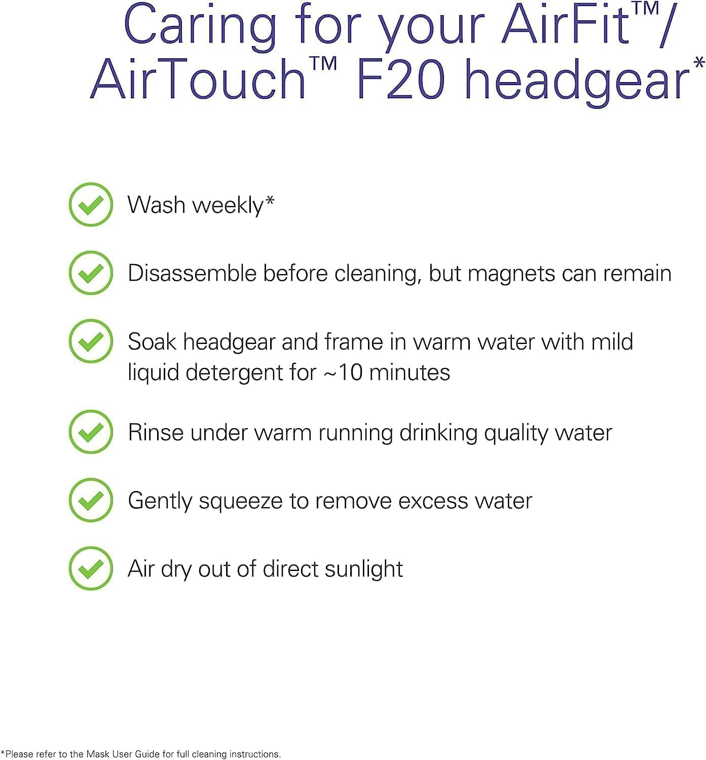 Compatibility - Compatible with ResMed AirFit F20 or AirTouch F20 full-face CPAP masks. Rescare replacement straps offer the same functionality at a great value. Superior Comfort and Fit - The plush, soft, and flexible CPAP Resmed AirFit F20 headgear ensures maximum comfort, allowing you to sleep and breathe easily throughout the night. Compatibility and Value - Specifically designed for ResMed AirFit F20 or AirTouch F20 full face CPAP masks, this headgear offers great value for money by providing two packs of standard-sized headgear, including clips. Enhanced Stability and Seal - The adjustable straps with strong touch-fasteners secure the mask firmly in place, preventing slippage and ensuring a proper seal for effective therapy. This maximizes comfort and reduces air leaks for an uninterrupted sleep experience. Durability and Easy Care - Made from premium elastic fabric and durable nylon material, the headgear is designed to withstand regular use and maintain its quality over time. It is easy to clean with mild soap, ensuring hygiene, and should be replaced every 3 months for an optimal fit and seal. Airfit/AirTouch F20 Headband - Replacement Headband - Super Soft with Plush Straps - , Blue (Size: - Large) Experience superior comfort with the plush CPAP headband for ResMed AirFit F20 and AirTouch F20 masks sex and convenience. Designed with your comfort in mind, this soft, flexible headgear ensures you a good night's sleep while letting you breathe easy. The headband features magnetic clips that make it easy to attach or detach the mask with just two simple snaps, providing a hassle-free experience. It is recommended to replace the headband every 3 months to maintain optimal performance. This headband is designed specifically for ResMed AirFit F20 and AirTouch F20 full-face CPAP masks for compatibility and versatility. Please note that the mask itself is not included