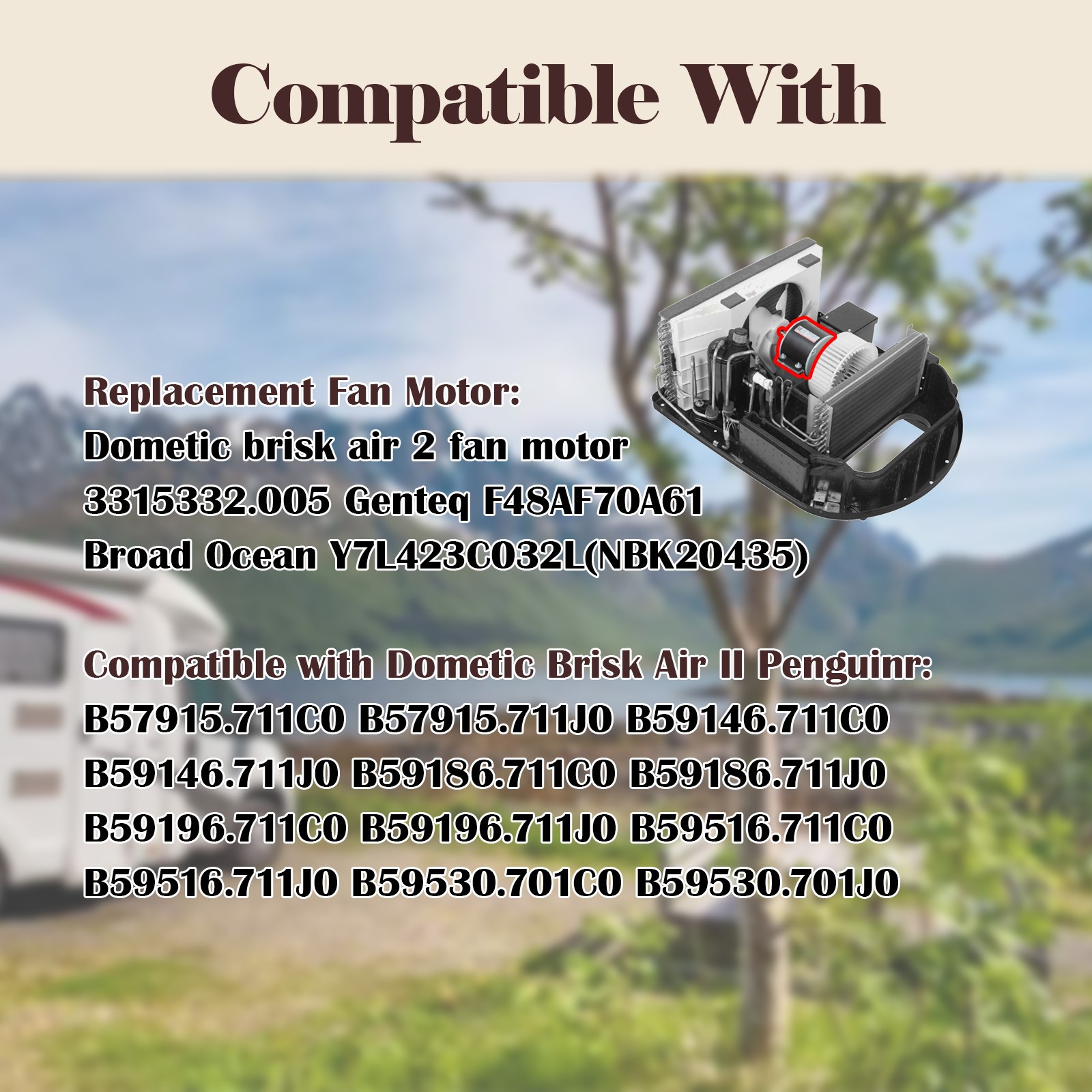 F48AF70A61 Fan Motor For Dometic 3315332.005 Brisk Air II RV Air Conditioners Product description 3315332.005 FAN MOTOR This motor replacement genteq f48af70a61 fan motor/dometic brisk air II fan motor/broad-ocen air condenser fan motor 3315332.005. 3315332.005 motor suitable for dometic RV, powers the fans and blowers that move air through the RV's air conditioning system. 3315332.005 fan motor responsible for generating the force required to move air through the air conditioning system. 3315332.005 MOTOR Condenser Fan Motor 3315332.005 D-Shaft 1: 3-5/16" L x 1/2" D D-Shaft 2: 2-7/16" L x 1/2" D Mounting Bracket Holes: 2-3/8" apart Motor Body: 5-5/8" Diameter x 4-3/8" Thickness Voltage: 115 V Hertz: 60 HZ Amps: 2.5, Horse Power: 1/4 RPM: 1650 Speeds: 3 Replacement Broad-ocen Air Condenser Fan Motor 3315332.005 Replacement genteq f48af70a61 fan motor/dometic brisk air II fan motor This rv ac fan motor 3315332.005 are typically made of high quality materials and manufacturing processes, have high durability and reliability, and can operate stably for a long time. An energy-saving design can reduce energy consumption. Working-Quietly High Quality Energy Saving Condenser fan motor 3315332.005 compatible with dometic brisk air II penguin models Condenser fan motor 3315332.005 compatible with dometic brisk air II penguin models: B57915, B59516, B59146, B59186, B59196. 3315332.005 motor can keep high speed operation for long time, help you enjoy your RV trip in harsh environment. 3315332.005 FAN MOTOR This motor powers the fan and blower wheel that moves air through the RV's air conditioning system. The RV air conditioner motor is responsible for generating the force required to move the air through the air conditioning system. It is designed to operate at high speeds for extended periods of time and is built to withstand the harsh conditions of RV travel.