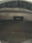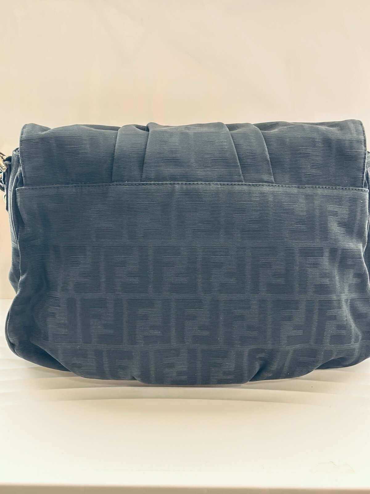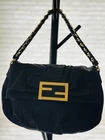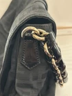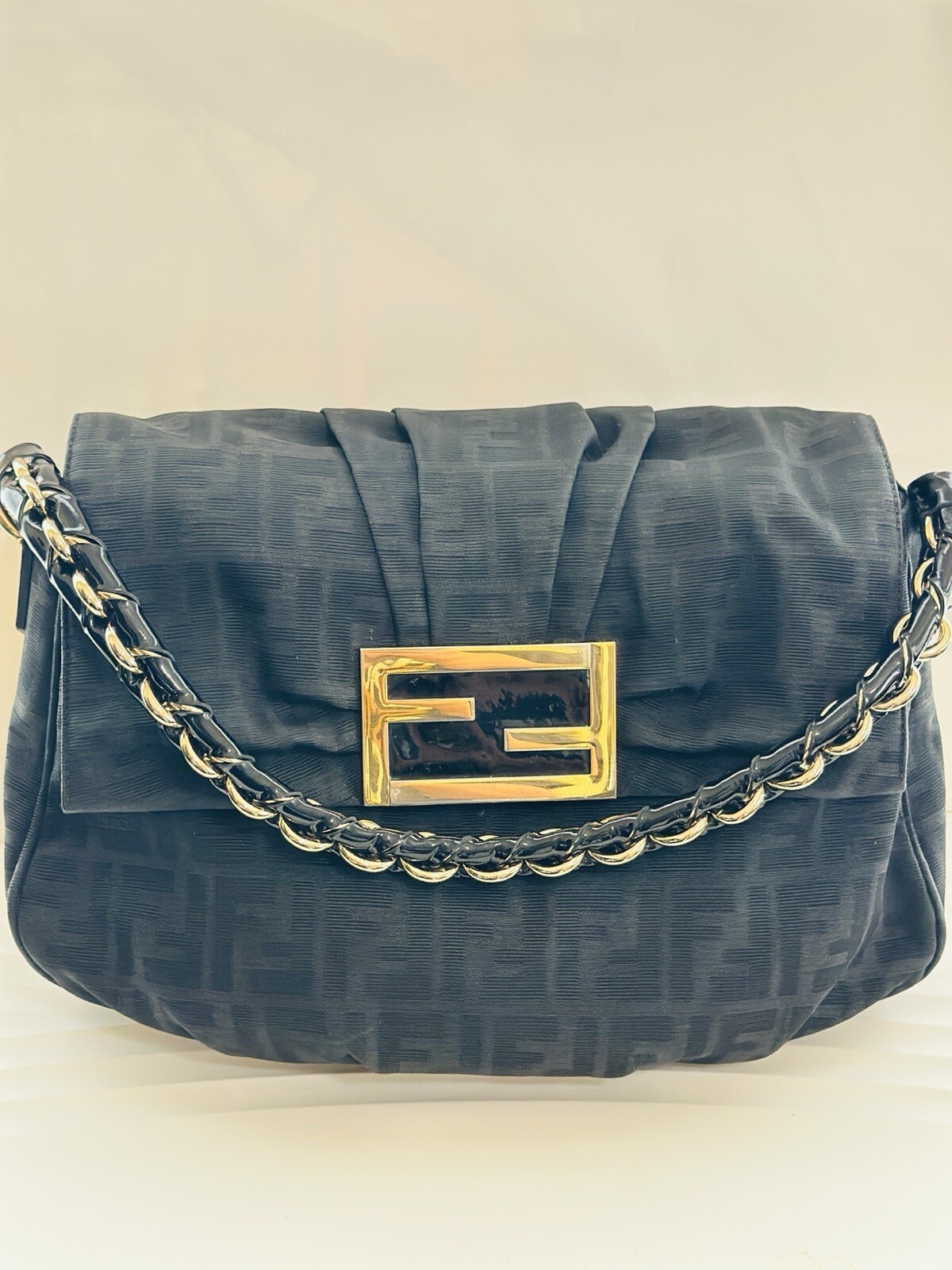 The FENDI Mia Zucca Pattern Chain Shoulder Bag in Black/Gray is a luxurious designer handbag crafted in Italy. Made with a canvas exterior and leather lining, this stylish shoulder bag features a magnetic closure and a chic chain shoulder strap. The iconic Fendi brand and unique Zucca pattern add a touch of sophistication to the overall design, making it a perfect accessory for any fashion-forward woman's outfit. With its high-quality craftsmanship and timeless elegance, this bag is a must-have for those who appreciate exquisite fashion.