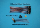 . "FIBER OPTIC 12 PACK SUPER VALUE MODEL LIGHTING KIT" This is over $250 in value!! . . . > Add lights to all your projects the EZ way with fiber optic lighting. . This auction is for everything you see in the picture above and in the description below. . . "FREE SHIPPING" Buy 2 or more items and pay shipping only on 1 item. You get free shipping on all additional items. . Please put all items in your cart for instant savings at check out. If you purchase more than 1 item without putting them in your cart I'll send you a refund as soon as I see your order. . Description of what you get in this kit: 8 packs of clear end glow fiber optic fiber (300 feet of .25mm, 200 feet of .50mm, 100 feet of .75mm, 50 feet of 1.0mm, 24 feet of 1.5mm, 12 feet of 2.0mm, 9 feet of 2.5mm and 5 feet of 3.0mm) plus 4 packs of colored fiber (150 feet of 0.25mm, 150 feet of .50mm, 75 feet of .75mm and 37 feet of 1.0mm). You also get 12 Bright white illuminators, 12 9v battery connectors, 12 mini on/off switches, 16 feet of extra hook up wire, 30 mini 4 inch cable ties and 24 inches of heat shrink tubing. Please see below for more info. . **FREE OFFER!! Now for a limited time you get the following free offer: 12 Special Effects illuminators, 3 switches and 3 9v battery connectors like in the picture below. These Special Effects illuminators twinkle/flicker. I have white, warm white, blue, red, green, yellow/amber, orange and UV purple. You can have any of these colors just let me know. White is the default color if you don't pick any others. This is over $49.00 in value! . . You get 8 packs of clear end glow fiber optic fiber fiber. 1 pack each: 300 feet of 0.25mm, 200 feet of 0.50mm, 100 feet of 0.75mm, 50 feet of 1.0mm, 24 feet of 1.5mm, 12 feet of 2.0mm, 9 feet of 2.5mm and 5 feet of 3.0mm. Each pack is 1 long continuous fiber so you can cut it to the sizes you need. Plus 4 packs of colored fiber, 1 pack each: 150 feet of 0.25mm, 150 feet of 0.50mm, 75 feet of 0.75mm and 37 feet of 1.0mm. The fiber tips will light up whatever color the fiber strand is when you use a white illuminator. They light up in very bright and intense colors. By using 1 white light source you can have 5 different colored fiber optic lights. They are very easy to cut with a hobby knife or scissors. If you cut them into 3 or more pieces and the 2 outer pieces will light up in color and the middle pieces will light up white when used with a white light. This gives you the option of having white too. These are also great for color coding your fiber optic runs so you can keep track of where each one is going. You get an equal amount of each of the 5 colors, Red, Blue, Green, Yellow and Orange. . You get 12 standard size fiber optic Micro illuminators. These have a bright white LED in them with a built in resistor that lets you use any DC power source between 3 volts and 18 volts. These are very easy to install on your models and projects. These are what lights up your fiber optic fibers. The black fiber guide tube on the end is approximately 1 inch long by 1/4 inch wide. The over all length is 8.75 inches long. You can use them with as few or as many fibers that you can fit in the tube. From 1 fiber to 150 fibers depending on the fiber sizes. You can connect as many illuminators as you need to one 9v battery. . You get (12) 9 volt battery connectors. These make it easy to use a 9 volt battery to light up your illuminators/fiber. These are high quality hard plastic and not the cheap vinyl type that break easy. These are appoximately 6.25 inches long. . You get 12 mini switches. These switches are awesome and super easy to install. Soldering is always best but not necessary with these switches or any of these components. These switches have holes in the terminals so jusr remove about a half inch of the insulation from the wires and then you can thread your red wire (positive) on the illuminator into one terminal and the red wire (positive) on the battery connector into the other terminal and twist them tight. Then twist the 2 black wires together. Cover the bare wires with heat shrink tubing or tape and you are all set. . 24 inches of Heat Shrink Tubing, 6 4 inch tubes that you can to any sizes you need with scissors or a razor blade. This is a easy way to cover your bare wires to prevent then from touching other bare wires or bare metal to prevent a short circuit. 30 mini 4 inch cable ties. These let you easily secure your wires or fiber optics fibers to your project or bundle them together. 16 feet of extra hook up wire, 4 rolls of 4 feet each. This makes it easy to make your illuminator wires longer if you want to set up your battery in a remote location. . . ITEM OVERVIEW: This kit is perfect for the Scale model builder. Fiber optic lighting gives you a super easy way to add just the right size lights to your projects. This kit gives you enough items to make 12 separate circuits and lets you add lights to 12 or more models or projects. All components of this kit are designed to be connected WITHOUT solder. . If purchased separately these items would cost over $250.00 12 Packs of fiber optic fiber: $10.99 each 12x $10.99 = $131.88 Illuminators: $4.29 each or $2.99 each for 4 or more 12x $2.99 = $35.88 9v battery connectors: $1.39 each or $1.19 each for 4 or more 12x $1.19 = $14.28 Switches: $1.39 each or $1.19 each for 4 or more 12x $1.19 = $14.28 Hook up wire: 14 cents a foot 16x 0.14 = $2.24 Mini cable ties: 5 cents each 30x $0.05 = $1.50 Heat Shrink Tubing: 6 cents per inch 24x $0.06 = $1.44 Total Value = $201.50 FREE BONUS ITEMS: 12 Special Effects illuminators: $3.49 each 12x $3.49 = $41.88 3 switches 3x $1.19 = $3.57 3 9v battery connectors 3x $1.19 = $3.57 Total = $49.02 Grand Total = $201.50 + $49.02 = $250.52 *If you need extras of any of these items please let me know. They are available for the prices above. Some items may come with an extra free bonus. Also you can swap any of these items for any other items I have that are of e