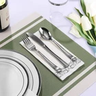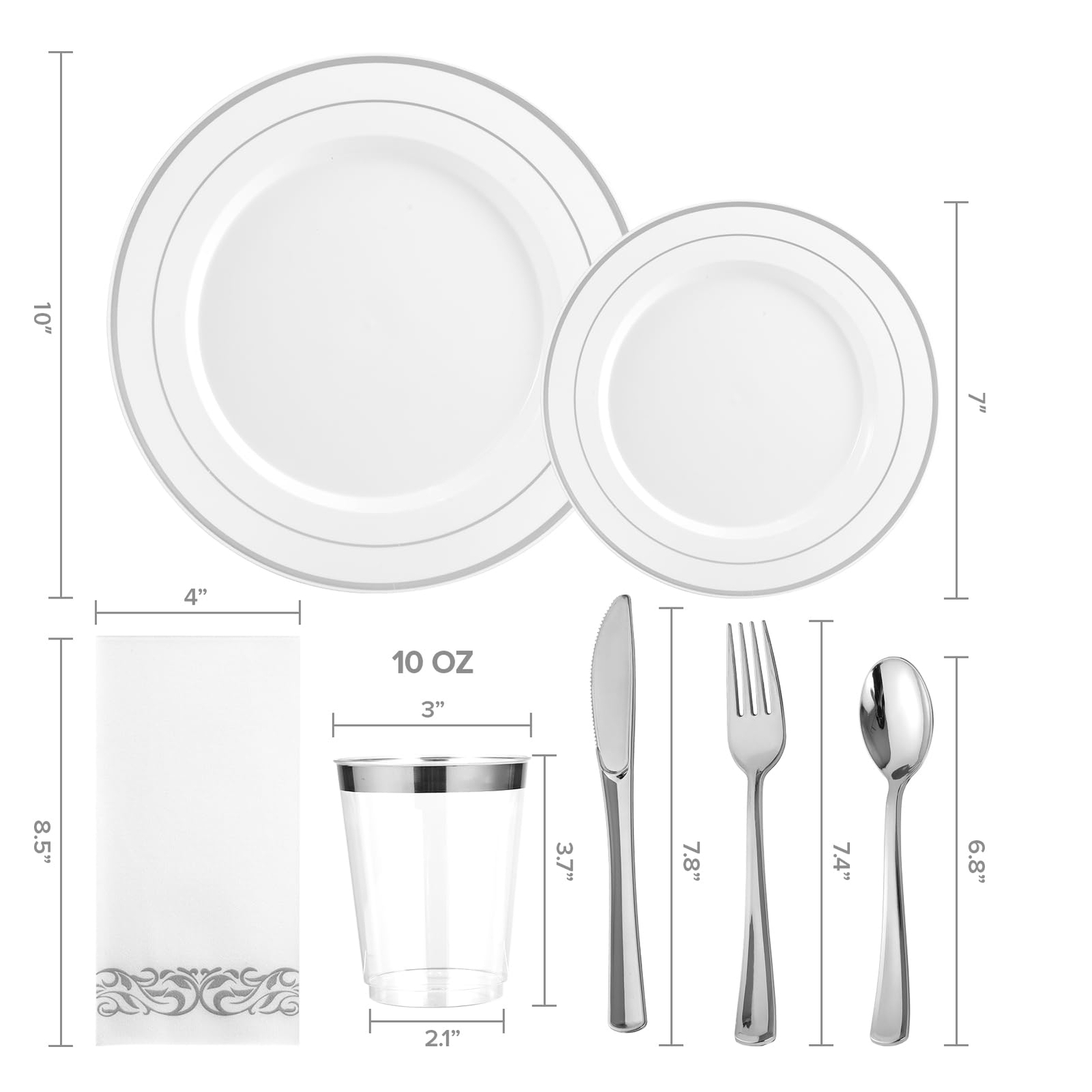FOCUSLINE 175pcs Silver Dinnerware Set for 25 Guests, White Plastic Plates with Silver Rim, Including 25 Disposable Dinner Plates, 25 Dessert Plates, 25 Silverware Set, 25 Cups, 25 Napkins Silver Dinnerware Set is safe for you and your guests! Disposable dinnerware set is made of 100% food-grade plastic, BPA free. The Heavy Duty dinner plates and salad plates offer reliable strength and durability, ensure won't scratch or break easily Premium quality decorative silver rim disposable dinnerware set made to save your time and energy, just toss the dinnerware when you’re done, no clean-up is necessary 25 Premium Heavy Duty Disposable 10" Silver Rim Dinner Plates And 25 7" Salad Dessert Appetizer Plates - Disposable Plastic Silver Silverware Set 25 Plastic Forks, 25 Plastic Spoons, 25 Plastic Knives 25 Count 10 Oz Clear Fancy Disposable Silver Rimmed Plastic Party Cups - 25 Count Soft and Absorbent Disposable Paper Napkins Ideal for Halloween, Christmas, Thanksgiving, Weddings, Formal Dinners, Birthday Parties, Graduations, Anniversaries, Festivals, Picnics, Catered Events, and All Occasions Shipping We offer FREE shipping on all orders! We ship within Three business days of payment, usually sooner. We use a selection of shipping services such as UPS, FedEx, USPS etc. We only ship to the lower 48 states, no APO/FPO addresses or PO Boxes allowed. Local pickups and combined shipping options are not provided at this time. Return You can return a product for up to 30 days from the date you purchased it. Any product you return must be in the same condition you received it and in the original packaging. Please keep the receipt. Payment We accept payment by any of the following methods: PayPal Please pay as soon as possible after winning an auction, as that will allow us to post your item to you sooner! Feedback Customer satisfaction is very important to us. If you have any problem with your order, please contact us and we will do our best to make you satisfied. Contact Us If you have any queries, please contact us via ebay. We usually respond within 24 hours on weekdays. Please visit our eBay store to check out other items for sale! Thank you for shopping at our store.