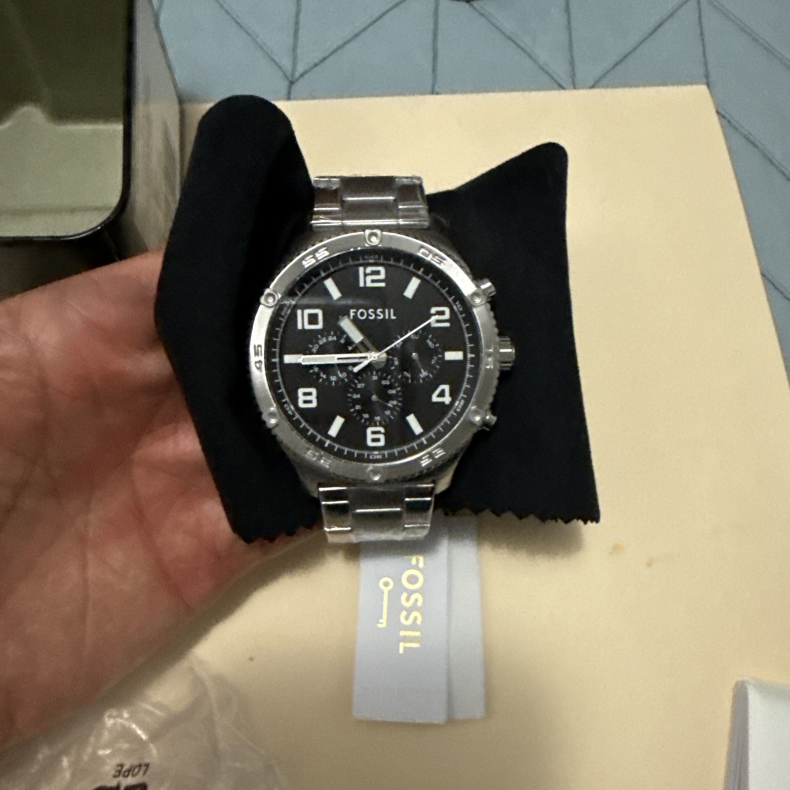 The Fossil Brox Men's Multifunction Watch features a sleek silver stainless steel case and bracelet with a fold-over push-button deployant closure. The large black dial with silver indices and Arabic numerals is complemented by features such as water resistance, luminous hands, a date indicator, and a 24-hour indicator. With a quartz movement, this stylish watch is designed for casual wear and comes in its original box and packaging, making it a great choice for the modern man looking for both fashion and function.