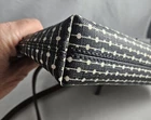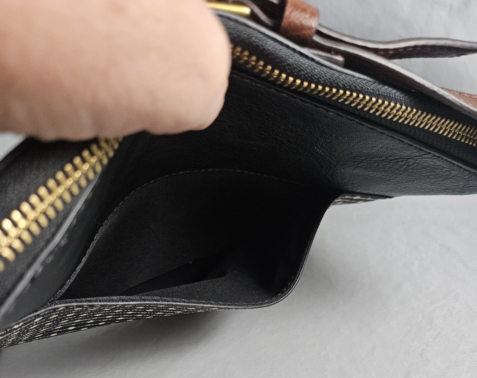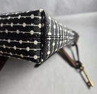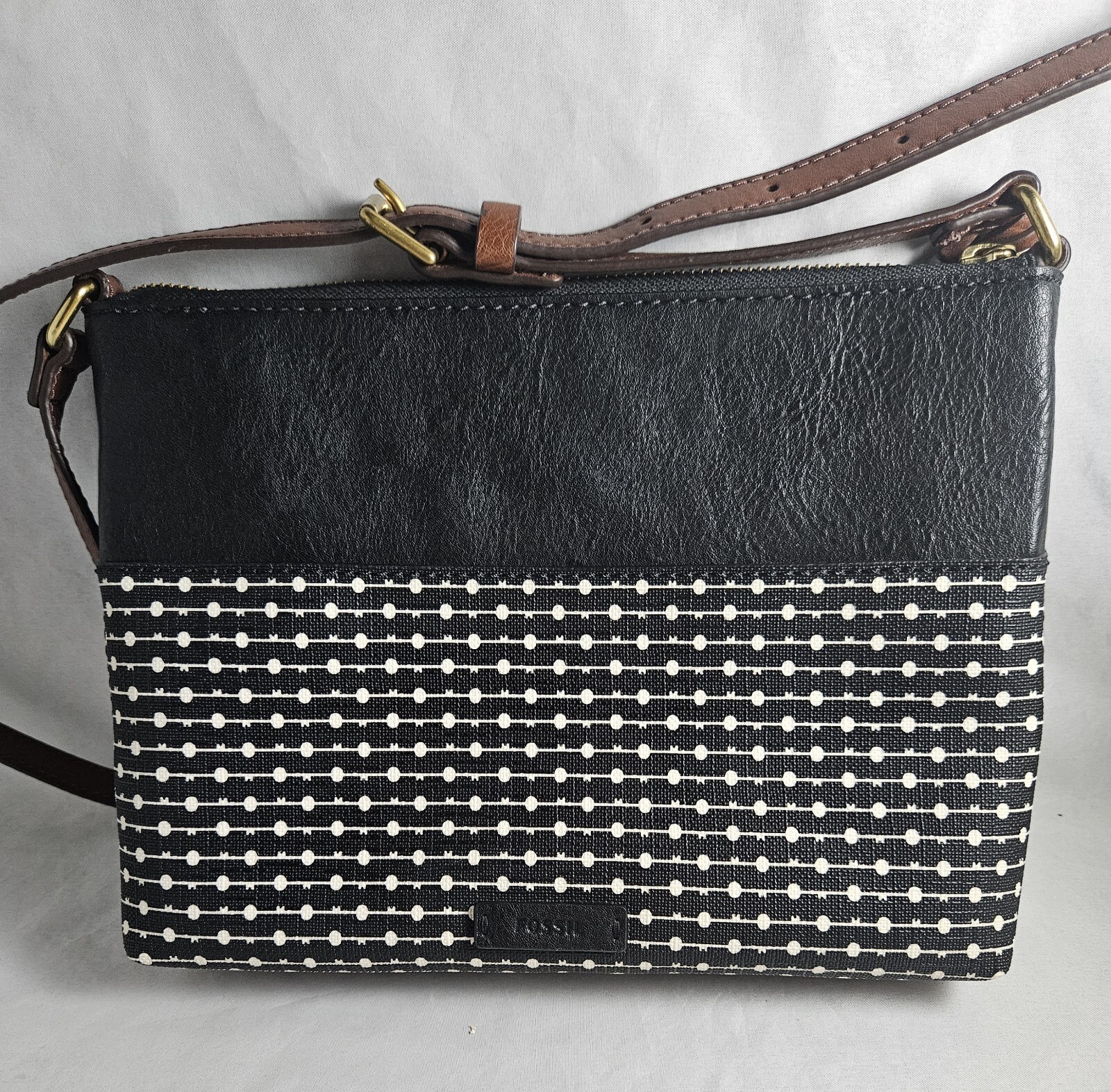 FOSSIL Fiona Faux Leather Crossbody Bag Black White Dash Dot Mini Key Pattern Zip This Fossil "Fiona" crossbody purse is made of simulated leather and coated canvas. With a square shape and a black and white dash and dot pattern, this bag is both stylish and functional. It has a zip closure and a crossbody strap made of faux leather, which can be adjusted. The bag measures 10 inches in width, 8 inches in height and 2 inches in depth. It has three inner and one outer pocket as well as a detachable strap and a key logo bag charm. The hardware is brassy gold in color and the bag is lined with black fabric and features a Fossil logo patch. This Fossil Fiona bag is slim, eco-friendly, cruelty free and lightweight, making it perfect for travel, parties, work and everyday use