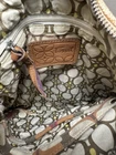 Beautiful vintage Y2K purse in very good CLEAN condition! The inside has really no sign of use! The canvas has its general fade but still vibrant in color! The straps, leather pull tabs and hardware are all in excellent condition! There is some sign of wear on the bottom corners as seen in the photos! The strap is tully adjustable and can be made fairly short at 14 inches long too much longer at 24 inches long! The bag is therefore versatile, in that it can be worn as a shoulder bag or a Crossbody bag as seen on the mannequin. Smoke free home! Ships fast same or next day!