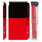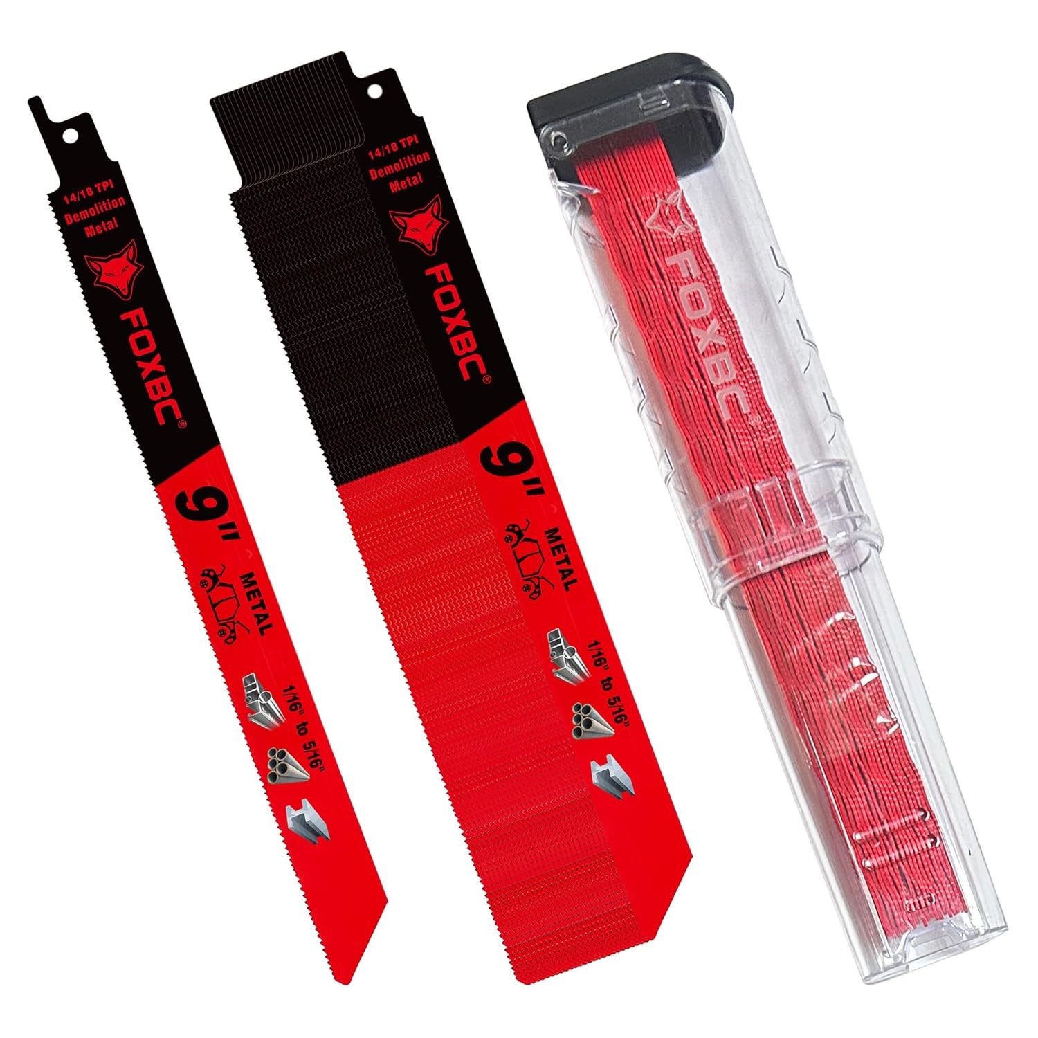 FOXBC 9 Inch 14/18 TPI Reciprocating Saw Blades Demolition for Auto Red Product Details Package Dimensions : 10.12 x 2.76 x 1.77 inches; 1.64 Pounds Manufacturer : FOXBC Country of Origin : China Material: Bi-Metal M42 Brand: FOXBC Color: Red Number of Teeth: 18 Style: Industrial Item Weight: 0.75 Kilograms Compatible Material: Metal Ideal for Cutting Metal 1/16" to 5/16", Angle, Tubing, Copper Pipe, Fiber Cement 9 Inch 14/18 TPI Specifically designed for maximum performance in metal cutting applications. perfect replacement for diablo steel demon sawzall blades Bi-Metal M42 Material with 8% Cobalt saw blades for extreme demolition cuts Optimal for rough-in cutting a wide range of demolition materials on the construction site and automobile-dismantling. Compatible with Black & Decker, DeWalt, Makita, Milwaukee, Porter Cable, Ryobi, Bosch, SKIL FOXBC reciprocating saw blades keeping your reciprocating saw, sawzall saw cutting HIGH PERFORMANCE FOR DEMON QUALITY and LONGER LIFE durability . Package includes: 25pcs saw blades with storage case