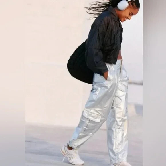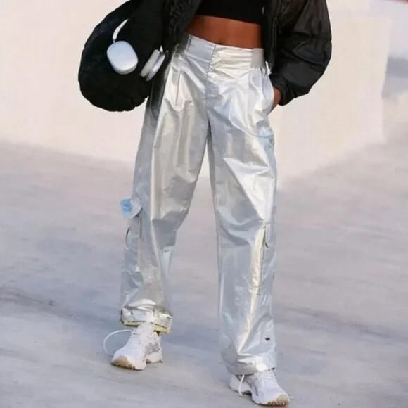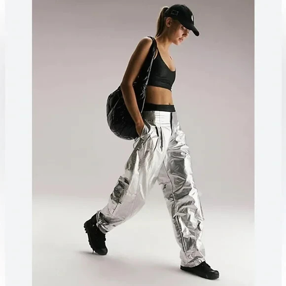 Cargo-cute in a new metallic hue, these pants feature a soft, breathable fabrication, flattering low-rise waist and plenty of pockets. Fit: Relaxed silhouette; low-rise waist; cargo style Features: Soft fabrication; cargo style; snap closure waist; relaxed silhouette; lower leg pockets Why We ❤ It: A new take on classic cargo, these pants add a pop of metallic shine wherever you go. FP Movement Care/Import Machine Wash Cold Import Measurements for size small Inseam: 31 in Waist: 26 in Rise: 11.25 in Contents 47% Rayon, 30% Nylon, 23% Polyester 70% Cotton