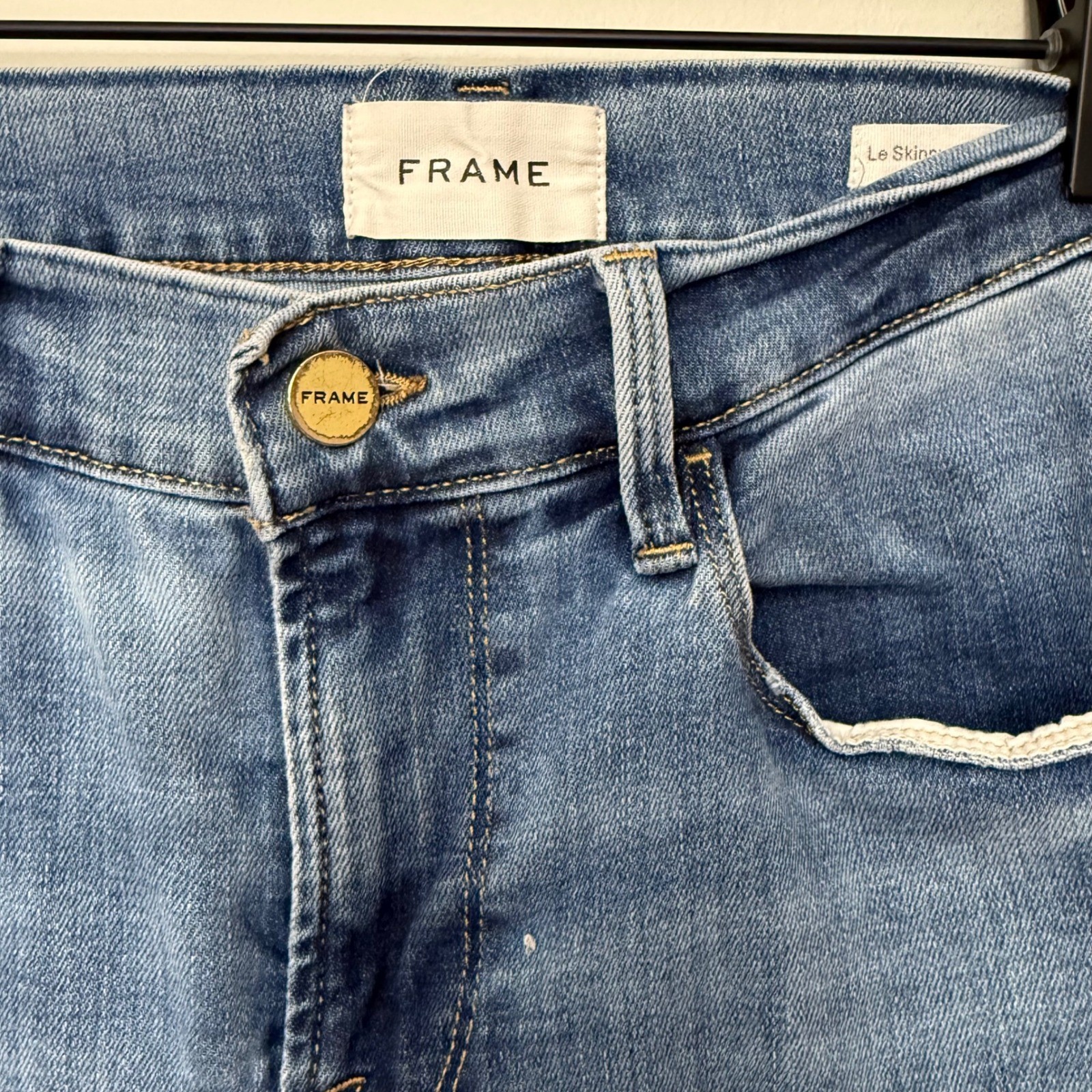 FRAME Le Skinny de Jeanne Crop Jeans, a stylish and versatile addition to any wardrobe. These jeans feature a flattering skinny fit that hugs the legs from hip to ankle, combined with a cropped length that's perfect for showcasing your favorite footwear. The jeans are designed with a comfortable mid-rise waist and traditional five-pocket styling, providing both functionality and a sleek silhouette. Made in Turkey. Small Spot on the back on leg as pictured. Measurements Waist 14 inches Inseam inches 28 inches Front Rise inches 9.5 inches Leg Opening 5.5 inches Please compare measurements to jeans you currently have before purchasing. Keywords: FRAME jeans, Le Skinny de Jeanne, cropped jeans, skinny jeans, denim jeans, blue jeans, size 28 jeans, womens jeans, designer jeans, casual jeans, mid rise jeans, FRAME denim, cropped denim