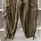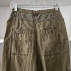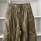 Slouchy cropped cargo pants featured in a baggy style with large pockets through the legs and drawstring ankle details. Pull-on style. Hip pockets. Adjustable drawstrings. Gently used condition. Size 4