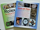 GREAT Gift & Book for Rolex Enthusiasts and Collectors! Welcome to our Store where you can find many more collector books and interesting watches for sale! This listing is for TWO Books: "Icons of Time," and a FREE Copy of the popular "Rolex - King of Time" book! - Icons of Time is a fantastic multi-brand book for any watch aficionado or enthusiast! It covers hundreds of iconic watches from the vintage and modern eras. With 138 pages and 280 quality photos, this book is not just about Omega and Rolex and other recognizable brands. It also covers important watches from Jaeger LeCoultre, Breitling, Lemania, Patek Philippe, IWC, Zenith and dozens more. - King of Time is a best-selling Rolex book that covers all aspects of vintage and modern Rolex watches. It is a great read for anyone interested in Buying or collecting Rolex watches. Please note that this free 120-page book is missing one page of photos (P.109). Both books make a great introduction into the fascinating Swiss watchmaking industry with a section on German watchmaking as well. These books encourage readers to research and learn about the market and each brand before spending thousands on watches with little research. A must-read for anyone who plans to buy a mechanical watch! Make sure to check out our other listings for more great books and interesting watches on sale!