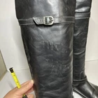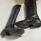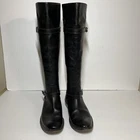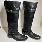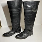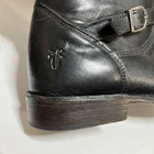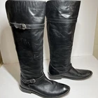 These are knee-high boots by Frye in black leather with double buckle straps. They have an almond toe shape, low heel, and a 1 inch platform height. Suitable for various occasions like travel, weddings, parties, casual wear, and work. The boots feature a biker, equestrian, and cowboy theme, and are crafted in Mexico with a leather upper and lining. The size is 7.5B (US) or 5.5 (AU/UK) with a regular calf width.