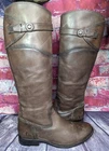 FRYE MOLLY BUTTON KNEE HEIGHT RIDING BOOTS - SIZE 8 B 100% Leather Imported Leather and Rubber sole Shaft measures approximately 15" from arch Heel measures approximately 1" 14" Circumference Knee-high riding boot with asymmetric opening and curved cuff with decorative logo buckle strap Full-length instep zipper