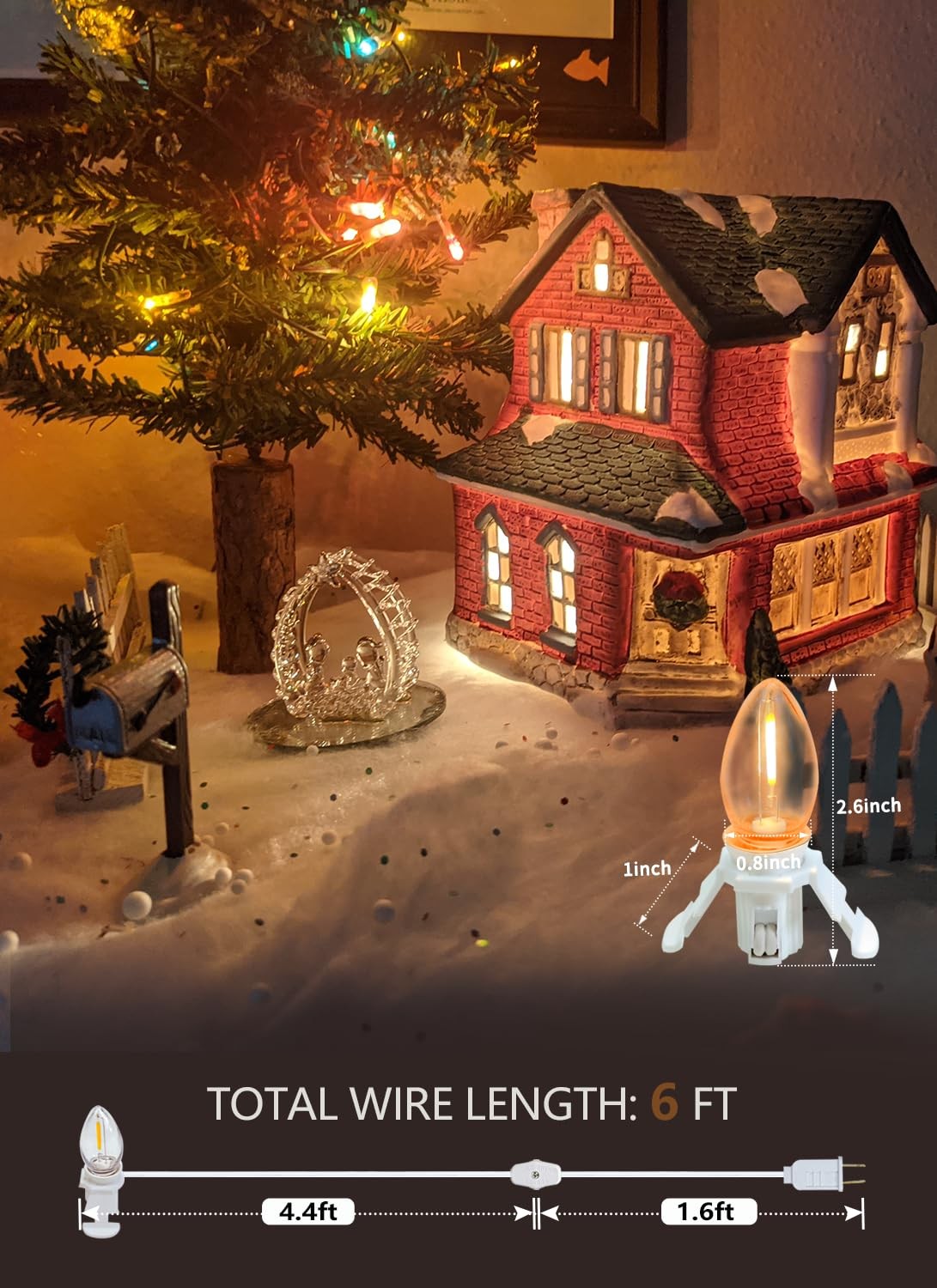 Set of 4 Accessory Cord with One5Led Light Bulb 6Ft Blow Mold Light IndoorString Lights, C7 Lamp with Spare Fuse forHalloween and Christmas Decorations.Craft Village House Decoration [Blow Mold Light Cord with Clip Bulb] C7/E12 Candelabra LEDBulbs, 120V / 0.6W (7 Watt equivalent incandescent) bulbs, 25,000hours lifespan, 50Lumes, 2700k soft Warm White, Non-Dimmable,simply attach the clip to fix each bulb into village house, craft, lampand more. [ Difference from other C7 light Cord ] Our switch is designed to becloser to the plug of Cord for you to adiust easily. With UL certified.this cord is Safe and durable. (Easy To Use] Put the light bulb into the Christmas village house orother small objects, turn on the switch and let the lights sprinkle allover the small room. Light up the bulb, and make your Christmas loodifferent, help you leave more profound memories, end the year withhappiness and get ready for the next year. [Package Includes] 4x led bulbs, 4x cords with plug, you canassemble easily. Warm Tips: Please make sure sunny day to use itoutdoors, it is not waterproof. [Buy With Confidence] 2-Year full warranty, our customer servicewill respond in 24 hours if you have any issues with the bulbs, and wewill offer replacement bulbs or refund for any defects.