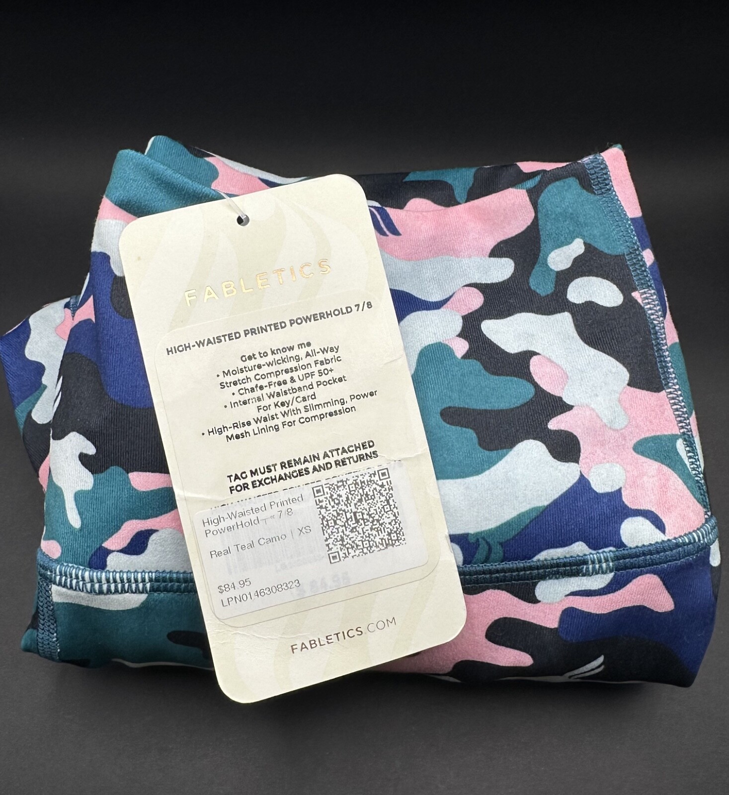 Fabletics Define PowerHold High-Waisted 7/8 Leggings NEW - XS - Real Teal Camo Features Chafe-Resistant Moisture-Wicking All-way Stretch Hidden Pockets UPF Protection Fabric PowerHold Fabric 88% Polyester/12% Elastane