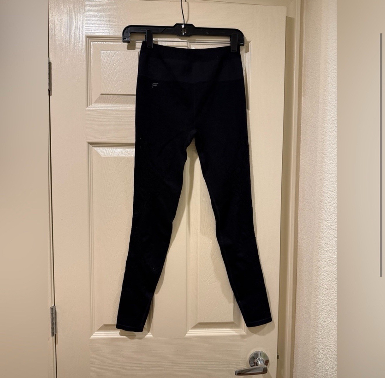 The product is a pair of Fabletics high waisted leggings in size XS, designed for women in the activewear category. The leggings feature flower embroidery on a textured black background, adding both style and a feminine touch. With a focus on the waist compression area, these leggings offer both comfort and support for various active occasions. Perfect for those looking for a blend of fashion and functionality in their workout attire.