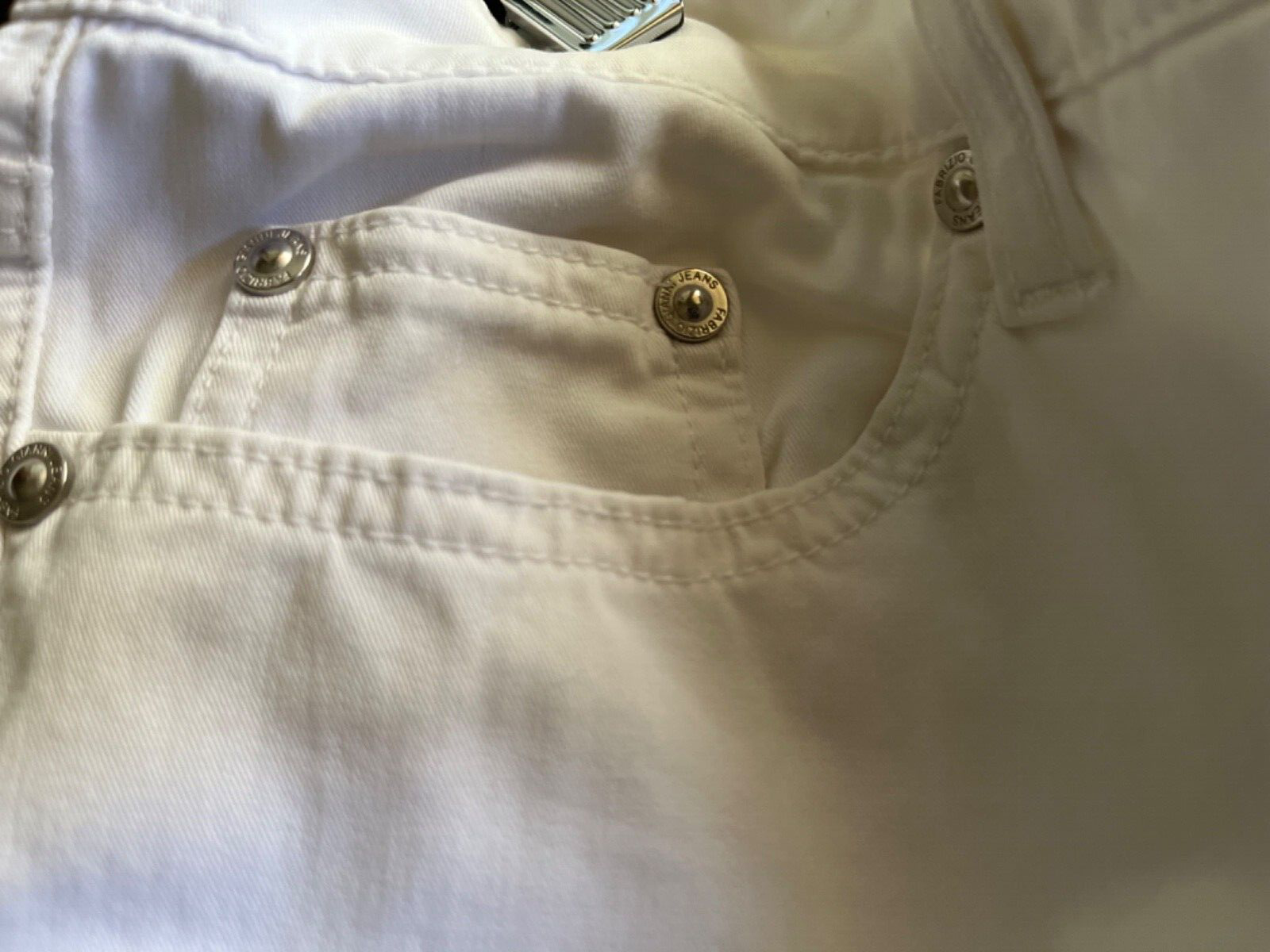 Terrific white cotton and spandex stretch jeans from Fabrizio Gianni, made in usa. Marked size 8. As we list we have two pair, gently enjoyed. Waist about 30, rise about 9, inseam 29 and hip area about 38. Measurements taken without stretching. If you purchase both we will combine shipping.