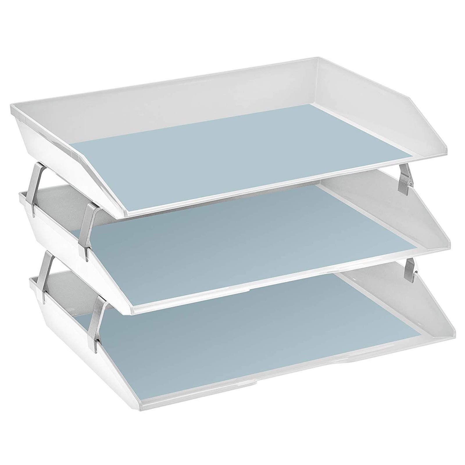 The Facility letter tray is made of high quality plastic, thick walls and metal brackets for unmatched durability and maximum stability, as well as anti slip and scratch bottom pad. Easy access to files. Features a slightly beveled on the front of the tray to prevent documents from slipping out. Additional brackets are available for extra levels (sold separately). Ideal for organizing documents, letters, files and much more. Perfect for offices, homes, clinics, hospitals, schools and many more. Accessories not included. Colors may vary due to different visual screen configurations. Others products available on Material: Constructed from durable plastic, ensuring longevity and resistance to wear and tear; Features sturdy aluminum brackets promoting extra height between triple trays, enhancing stability and allowing for efficient organization of documents; Textured Surface and Beveled Front: The textured surface on the tray and the slightly beveled front of the letter tray prevent documents from slipping out, maintaining organization and preventing potential messes; Anti-Slip and Scratch Bottom Pads: Equipped with anti-slip and scratch bottom pads, providing additional stability and protecting surfaces from damage; Expandable Option: Additional brackets are available to add more levels (Sold separately on as Metal Support Brackets), offering flexibility to customize and expand storage capacity as needed; Sleek Desk Appearance: With dimensions of 14" X 10 1/2" X 9 1/4” when assembled, it boasts a compact and visually appealing design that enhances the aesthetics of any desk or workspace;