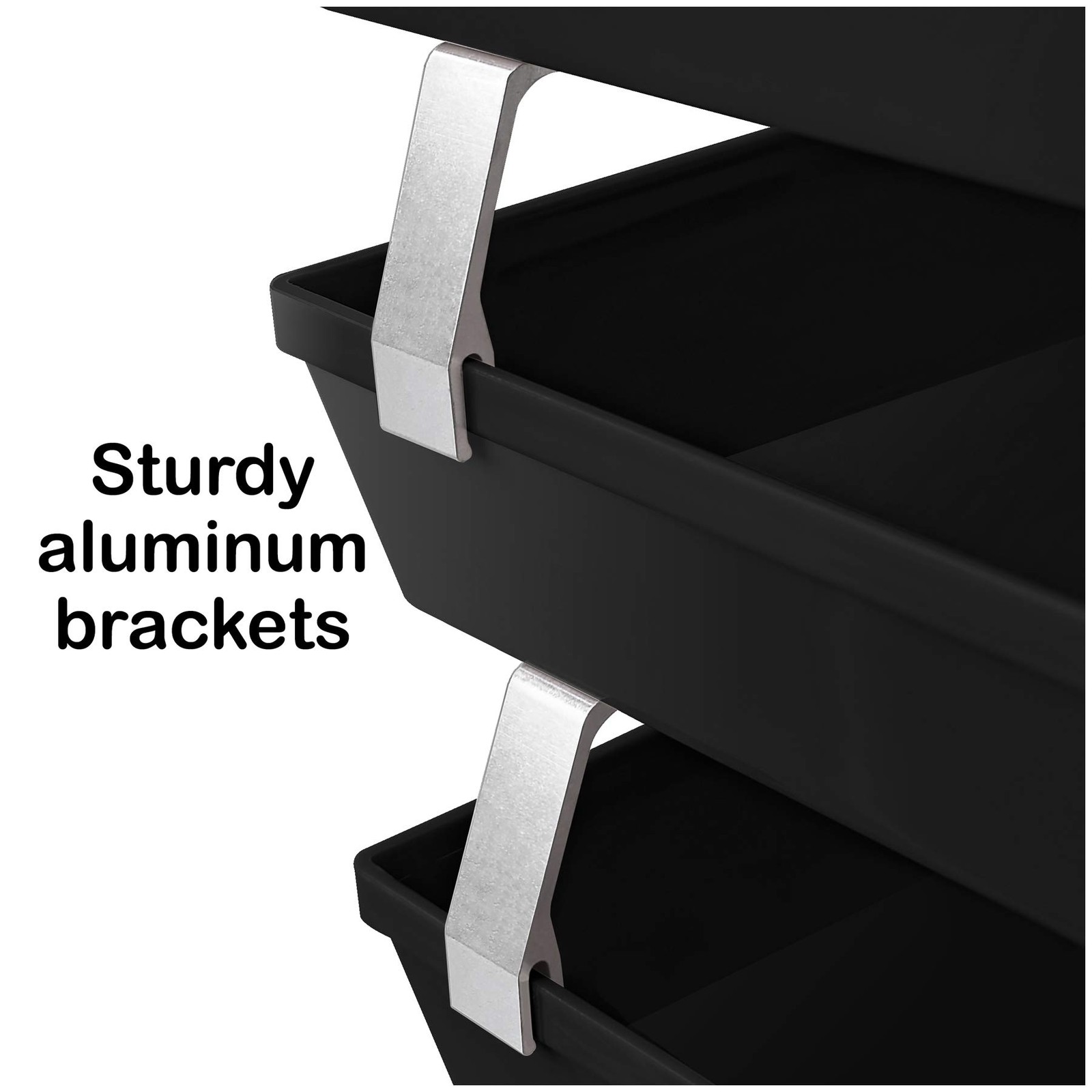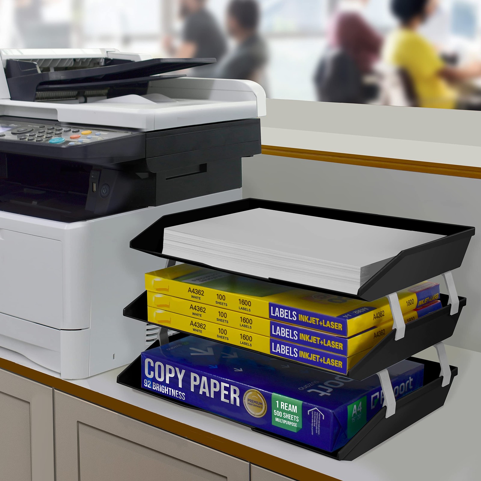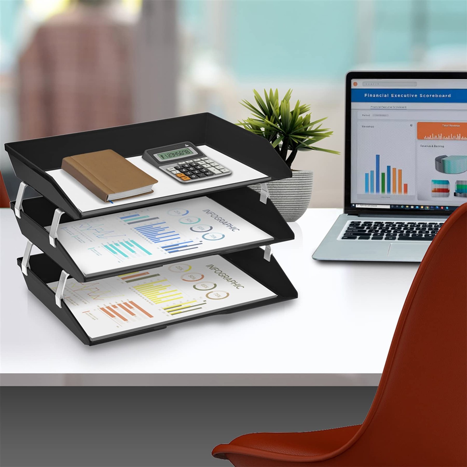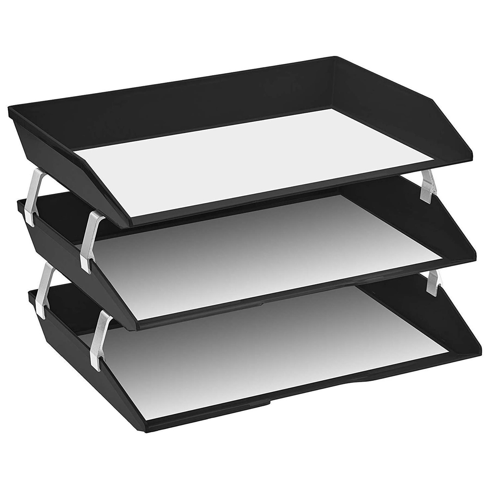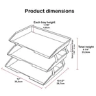 Material: Constructed from durable plastic, ensuring longevity and resistance to wear and tear; Features sturdy aluminum brackets promoting extra height between triple trays, enhancing stability and allowing for efficient organization of documents; Textured Surface and Beveled Front: The textured surface on the tray and the slightly beveled front of the letter tray prevent documents from slipping out, maintaining organization and preventing potential messes; Anti-Slip and Scratch Bottom Pads: Equipped with anti-slip and scratch bottom pads, providing additional stability and protecting surfaces from damage; Expandable Option: Additional brackets are available to add more levels (Sold separately on as Metal Support Brackets), offering flexibility to customize and expand storage capacity as needed; Sleek Desk Appearance: With dimensions of 14" X 10 1/2" X 9 1/4” when assembled, it boasts a compact and visually appealing design that enhances the aesthetics of any desk or workspace;