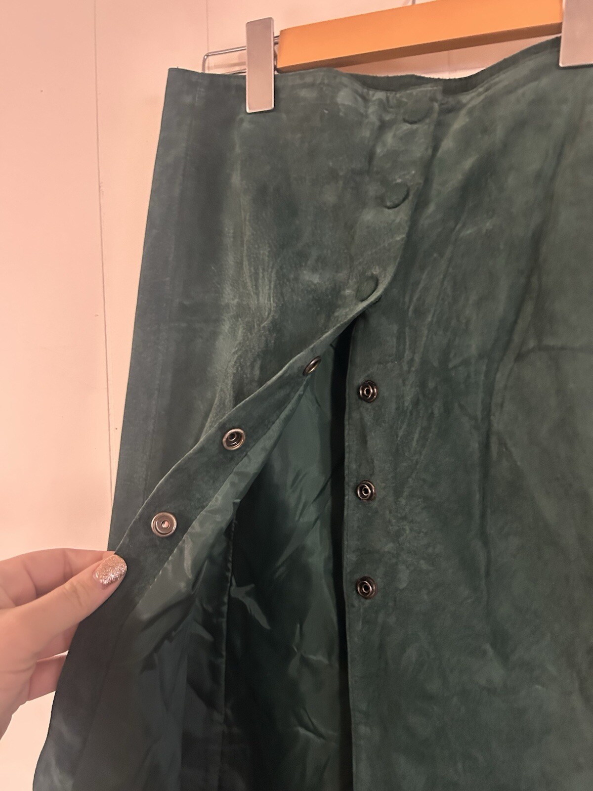 Fairweather Size 8 Green 100% Genuine Leather Skirt features a luxurious suede feel with a button back detail, adding a touch of sophistication to your wardrobe. This straight & pencil style midi skirt is lined for added comfort and is perfect for any occasion. Made with high-quality materials, this skirt is a timeless staple that will elevate any outfit with its solid green color and stylish accents. Excellent condition No damage or stains Vintage skirt Made in Korea Smoke and Pet free home