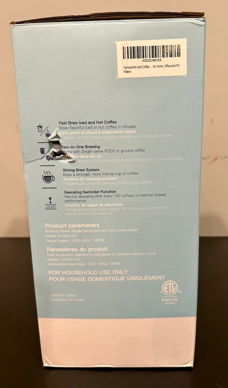 UPC:doesnotapplyMaterial:Stainless SteelPower Source:ElectricalType:Pod Coffee Machinegtin13:doesnotapplyColor:BlackCoffee Type:Ground Coffee, PODSBrand:FamiworthsSeller Notes:“Open Box. The box shows some wear/damage but product still unused/sealed.”Model:KTS2210IC