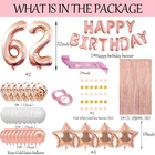 Package Include: 1.1 x "HAPPY BIRTHDAY" Banner foil balloons Rose gold--16inch 2.1 x "HAPPY BIRTHDAY" Sash Rose gold 3.4 x star shape Foil Balloons,rose gold--18" 4.2 * Number Foil Balloons,rose gold--32" 5.2 * Champagne bottle goblets Balloons--40" 6.10 * Latex Balloons.rose gold--10inch 7.6 * Latex Balloons,rose gold--12" 8.10 * Confetti Balloons, rose gold--inch" 9.1 * Tinsel Foil Fringe Curtains--40inch x 80inch 10.1 * star hanging paper banner(gold&pink)--length=4m 11.straws and ropes-1 【HAPPY 62ND BIRTHDAY】- Designed for your 62ND birthday party.The set contains everything you will need.And can be used to celebrate the 62ND birthday(Just swap the numbers). 【VALUE PACK】- As the picture appeared,the package includes:1 x "HAPPY BIRTHDAY" Banner ,star hanging banner(4m),happy birthday sash,number 6+2 foil balloons and star ballons(18inchx4pcs),26pcs latex and confetti balloons,Foil Fringe Curtains and more. 【HIGH QUALITY】- Made from high quality material. All balloons from this set are non-, safe,durable,Easy and fun to hang and assemble. 【USE TIPS】-No need to assemble, use a straw to blow the foil balloon,With self-sealing function, and then use a rope to hang them. You can also use glue to fix that on the wall. Many balloons can form the shape you want, easy to use. 【RISK-FREE 】- Each product has been carefully inspected and can be purchased with confidence. Once you have any questions, we will , so that you are 100% satisfied.
