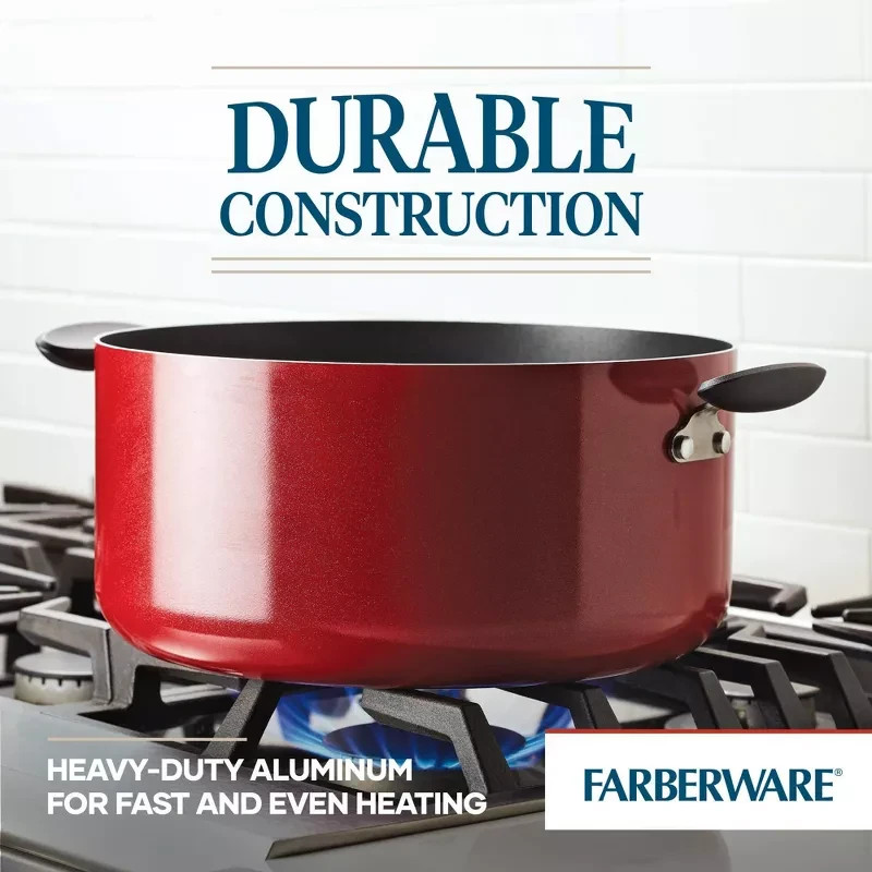 This Farberware stockpot is a kitchen game-changer! The sturdy aluminum heats evenly, and the nonstick interior makes cleanup a breeze. Love the vibrant red exterior—it brightens up my stove. The double-riveted handles feel secure, even when full. Perfect for soups, pasta, or big-batch meals. Just remember to use medium heat to keep the nonstick in top shape. Dishwasher-safe is a huge plus! Highly recommend for hassle-free cooking.