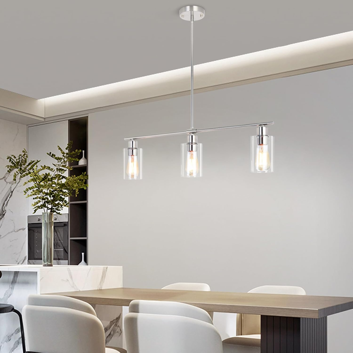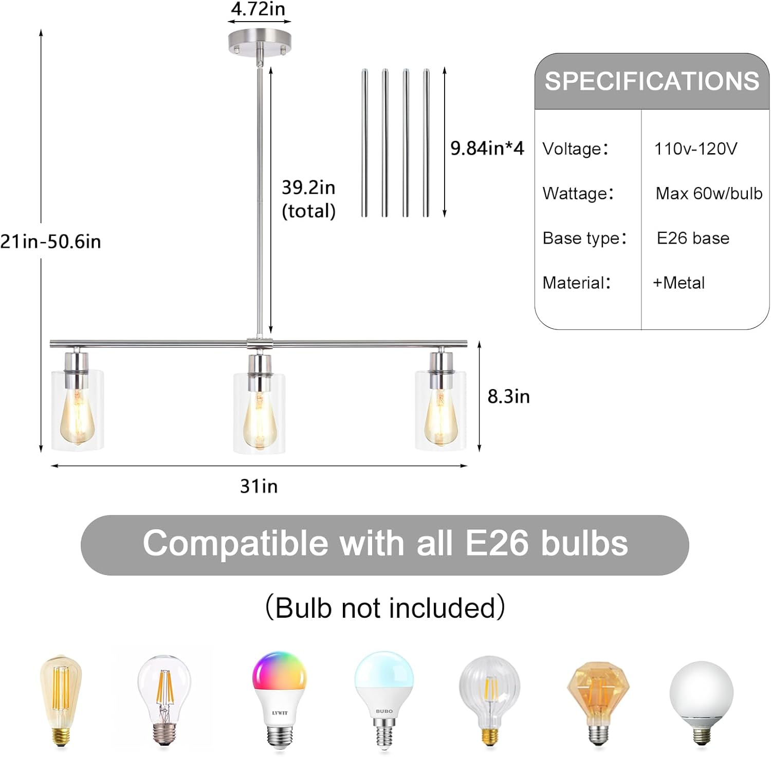 Store New Arrivals Add to Favorite View Feedback Contact Farmhouse 3-Light Kitchen Island Pendant, Modern Brushed Nickel Chandelier Description Light Source Type LED, Edison, incandescent, CFL and halogen bulbs Item model number 3-Light Linear Chandelier Style Modern,Industria,Rustic,French,Country,Farmhouse,Vintage Number of Items 3 Power Source AC Fixture Type Non Removable Number of Light Sources 3 Control Method App Theme Farmhouse Batteries Included? No Lighting Method Downlight Specification Met UL Controller Type Push Button Unit Count 1.0 Count Room Type Dining Room, Entryway, Hallway, Kitchen, Living Room Assembly Required Yes Material Metal Installation Type Semi Flush Mount Model Name 3-Light Linear Chandelier Finish Type Brushed Specific Uses For Product Dining Room chandelier, Entryway chandelier, Hallway chandelier, Kitchen Island chandelier, Living Room chandelier Included Components Instruction Manual, Linear Chandelier, Mounting Hardware Indoor/Outdoor Usage Indoor Bulb Base E26 Light Color warm white Water Resistance Level Not Water Resistant Batteries Required? No Item Weight 4.8 pounds Light fixture form Pendant Special Features Adjustable Height, Anti-Rust, Dimmable Special Feature Adjustable Height, Anti-Rust, Dimmable Shade Color clear Mounting Type Ceiling Mount Color Nickel Island Light Wattage 60 watts Shape linear Voltage 110 Volts Plug Format A- US style Recommended Uses For Product Dining Room pendant light, Entryway pendant light, Hallway pendant light, Kitchen Island pendant light, Living Room pendant light Shade Material Glass Finish types Brushed Product Dimensions 17.52"L x 6.89"W x 11.02"H Switch Type Push Button Elegant & Modern Design — Upgrade your space with this kitchen island chandelier. Its sleek metal frame and clear glass shades create a perfect blend of modern and farmhouse styles. Ideal as a chandelier for a kitchen island, a dining room chandelier over a table, or a foyer centerpiece. Adjustable for Any Ceiling — Designed for versatility, these island pendant lights for the kitchen adapt to flat, sloped, vaulted, or slanted ceilings. The four sturdy 9.8" rods allow you to adjust the height from 21" to 50.6", making it perfect as kitchen pendant lights or a linear chandelier. Bulb Compatibility & Dimmable — Compatible with 3 × E26 bulbs (not included), such as LED, Edison, incandescent, CFL, and halogen (max 60W each). Fully dimmable with a compatible dimmer switch (not included), making it a stylish hanging light fixture for any mood. Durable & Easy to Install — Expertly crafted from high-quality metal for lasting durability and a sleek finish. This kitchen island pendant light includes all necessary mounting hardware and detailed, step-by-step instructions, ensuring a hassle-free and effortless installation. Versatile for Any Space — From kitchen island lighting to dining room light fixtures over a table, this linear pendant light enhances any room, including the foyer, bedroom, entryway, living room, balcony, and farmhouse settings. Product description 1 Dining Room 2 Kitchen Island 3 Living Room Height adjustable ABOUT US We’re committed to offering great deals on quality products you can trust. From home décor and garden essentials to tools, hardware, and pet accessories, there’s something for everyone at prices you’ll love. SHIPPING Orders ship directly from the USA for fast and reliable delivery. Most items ship within 1 business day and include free shipping to the lower 48 states. International orders are fulfilled through eBay’s Global Shipping Program. Simply proceed to checkout to view shipping costs, duties, and taxes for your country. FREE RETURNS We offer a 30-day return policy on items you are not completely satisfied with. You may choose a full refund or an exchange.. CUSTOMER SATISFACTION We do everything we can to ensure every customer is fully satisfied. If something is not right, send us a message and we will take care of it quickly.