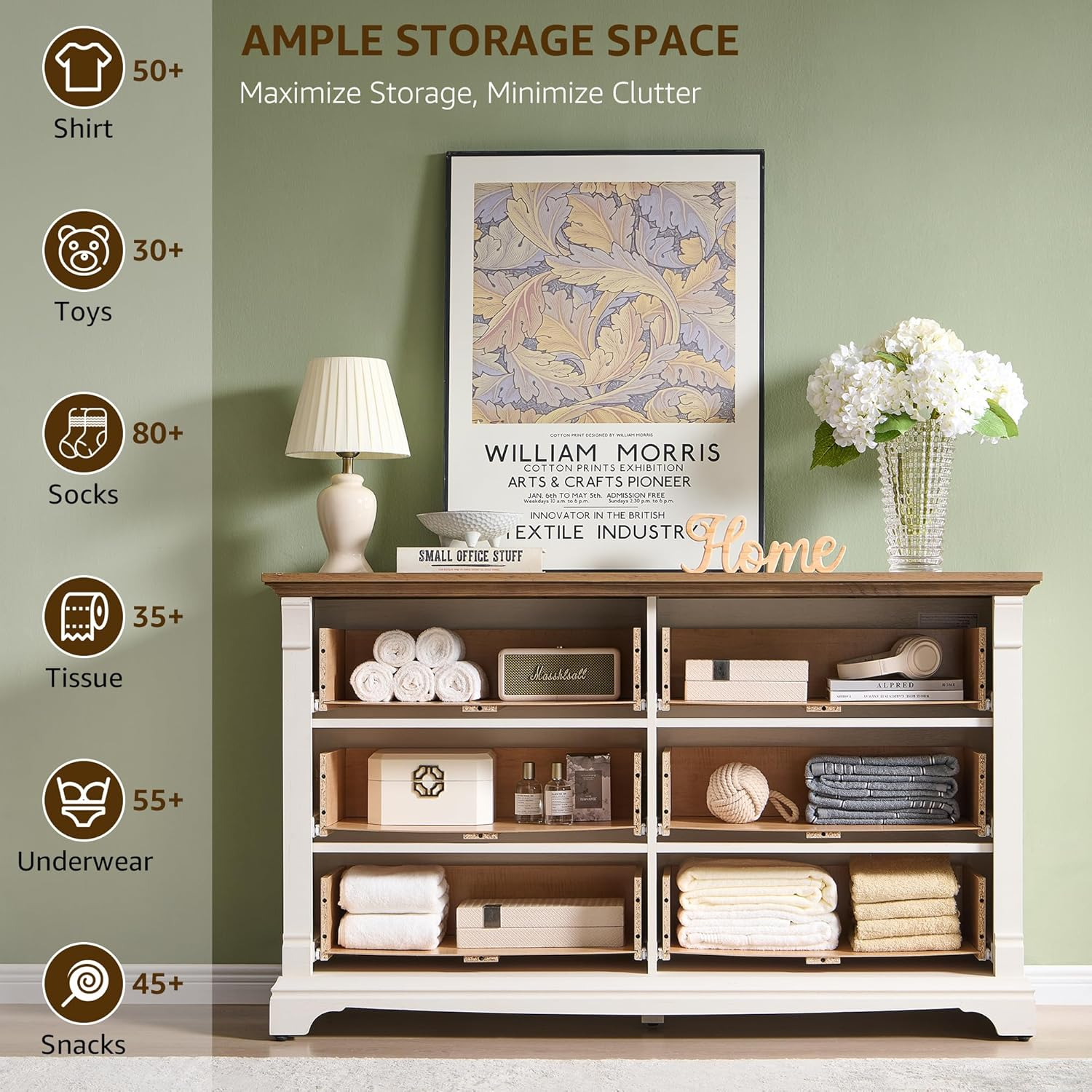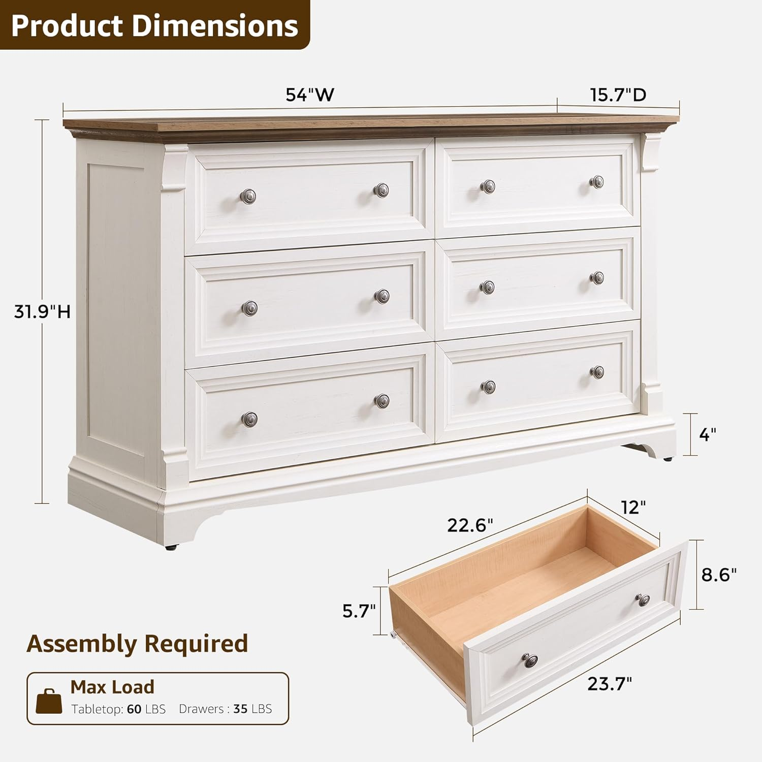 Store New Arrivals Add to Favorite View Feedback Contact Farmhouse 6 Drawers Dresser for Bedroom, 54" Wide Large Dressers & Chests of Drawers W/Roman Column, Wooden Dresser TV Stand with Large Drawers for Nursery Bedroom Living Room Hallway, Antique White Description Room Type Bedroom, Living Room, Hallway Assembly Required Yes Color Antique White Target Audience Adult Brand T4TREAM Material Engineered Wood Size 16"D x 54"W x 32"H (6 Drawers) Number of Drawers 6 Number of Pieces 1 Finish Type Wood Product Dimensions 16"D x 54"W x 32"H Product Care Instructions Wipe with Dry Cloth Manufacturer T4TREAM Rustic Farmhouse Charm with Authentic Character:This 6 drawer dresser brings warmth to any bedroom with its imitation wood grain finish. Each piece features distinctive patterns and textures that create authentic rustic charm. Vintage-inspired details add nostalgic elegance, making this chest of drawers for bedroom a perfect centerpiece for your bedroom dresser set. From embossed textures to Roman column accents, every element crafts a welcoming farmhouse atmosphere. Vintage-Inspired Design with Meticulous Craftsmanship:Our farmhouse dressers for bedroom blend vintage aesthetics with modern functionality. The drawer fronts feature intricate decorative lines that create depth and sophistication. You'll discover meticulously crafted details that exude elegance. The recessed curved base reduces visual bulk while Roman columns add timeless appeal to this dresser chest, perfect for any decor style. Exceptional Storage Capacity with Smart Organization:Measuring 54"W × 15.75"D × 31.89"H, this six drawer dressers for bedroom features 6 generously sized drawers (5.7" deep each) that accommodate clothing, quilts and linens. Combine two units to create a 12-drawer farmhouse dresser for expanded storage. The spacious tabletop serves as an ideal display surface for framed photos or bedside essentials. Premium Construction Built to Last:Constructed with FSC-certified materials, this wooden chest of drawers delivers exceptional durability. Sturdy Roman columns and reinforced legs provide stability, while the water-resistant finish ensures easy maintenance. An included anti-tip device makes this bedroom dresser set both safe and long-lasting for years of daily use. Hassle-Free Assembly with Comprehensive Protection:We've simplified assembly with clear instructions and numbered components. A spare parts kit is included, allowing two adults to easily assemble this 6 drawer dresser. Your farmhouse dressers for bedroom arrives protected by foam and wooden panels, ensuring perfect condition. Our support team is always available to assist you. Product description T4TREAM Farmhouse Bedroom Furniture Set Add to Cart Add to Cart Add to Cart Add to Cart Add to Cart Add to Cart Customer Reviews 4.9 out of 5 stars 32 4.9 out of 5 stars 32 4.9 out of 5 stars 32 4.4 out of 5 stars 141 4.9 out of 5 stars 24 5.0 out of 5 stars 9 4.4 out of 5 stars 141 Price $279.99 $ 279 . 99 $289.99 $ 289 . 99 $259.99 $ 259 . 99 $559.99 $ 559 . 99 $129.99 $ 129 . 99 — $509.99 $ 509 . 99 Size 16"D x 54"W x 32"H 16"D x 54"W x 32"H 16"D x 32"W x 47"H 90"L x 81.2"W x 54"H 18"D x 18"W x 24"H 23.6"D x 15.7"W x 26"H 90"L x 65.2"W x 90"H Number of drawers 6 7 5 4 2 3 4 Charging Station ✘ ✘ ✔ ✔ ✔ ✔ ✔ Assembly Needed ✔ ✔ ✔ ✔ ✔ ✔ ✔ Material Engineered Wood, Metal Engineered Wood, Metal Engineered Wood, Metal Engineered Wood, Metal Engineered Wood, Metal Engineered Wood, Metal Engineered Wood, Metal 1 Your Needs, One Dresser 2 Double Your Storage Effortless Operation, Silent Comfort Enjoy a seamless experience with our smooth-gliding drawer system. Even when fully loaded, the drawers open and close quietly and effortlessly, ensuring lasting peace and tranquility in your bedroom. 6 Drawers Storage This famhouse dresser features deep, spacious drawers designed to hold everything from bulky sweaters to delicate linens. Keep your bedroom clutter-free and essentials neatly organized and within easy reach. Metal Handle Sleek & Secure Pull: Combines a modern metallic accent with a solid, comfortable grip for durable elegance and smooth operation. Recessed Line Panel Elegant Textured Detail: Features refined recessed lines that create a sophisticated play of light and shadow, adding visual interest. 1.57-inch Thick Panel Substantial & Stable Build: Crafted from thick, high-quality material to convey a luxurious feel and ensure exceptional durabilit. 2-Leveling Anti-Tip Feet 2-Leveling Anti-Tip Feet: Adjust front leveling screws for stability and anti-tip protection. 1 Antique White 2 Light Rustic Oak 3 Reclaimed Barnwood 4 Dark Rustic Oak ABOUT US We offer the best prices around on high quality products. Our E-store includes media such as books, movies, music and games while offering electronics, toys, sporting apparel, clothing, tools, general home, garden items and more. SHIPPING We are always working hard to ensure your package arrives as soon as possible. Please understand that some factors like weather, high postal traffic, and the performance of shipping companies are outside of our control. RETURNS We offer a 30-Day Return Policy on items which you are not completely satisfied with. You have the option for a full-refund or an exchange of the item. No returns are available on items shipped outside of the USA. PAYMENT We accept PayPal. CONTACT US This page content is yet to come Please ad us to your favorite seller and visit again later Thank You CUSTOMER SATISFACTION We try our very best to make sure every customer is completely satisfied. If there's a problem, message us! We're happy to help. WE ACCEPT Copyright © 2021 AutoDS. | All Rights Reserved