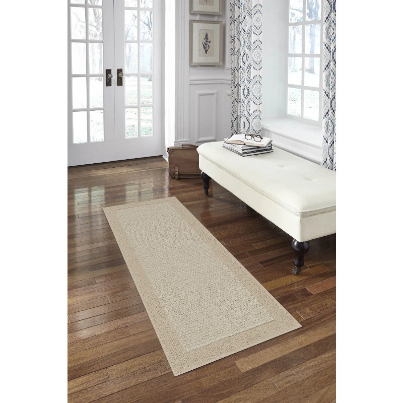 Add style and functionality to your home with the Mainstays Traditional Faux Sisal Border Area Rug or Runner Rug. There are five border color options which include Gray, Beige, Brown, Red and Black. With multiple size options, it's a breeze to find the perfect rug for your space whether it be a living room, bedroom, dining room, kitchen, or home office. Quality crafted of 100% olefin yarn, this rug will stand up in even the heaviest of traffic areas with its stain and fade resistance. The Mainstays Faux Sisal Rug Collection features non-skid latex backing on all sizes to help keep the rug in place on your floors. Multiple size and color options are available to purchase individually or in 3-Piece Rug Sets. 100 Percent Olefin Yarn High Low Loop Tufted Construction Skid-Resistant Latex Backing Rug Size is 1'9" x 5' or 21 inch x 60 inch 0.44 Inch Pile Height Beige Border Colorway Machine Washable Stain and Fade Resistant Indoor Use Tufted in the USA Mainstays Brand